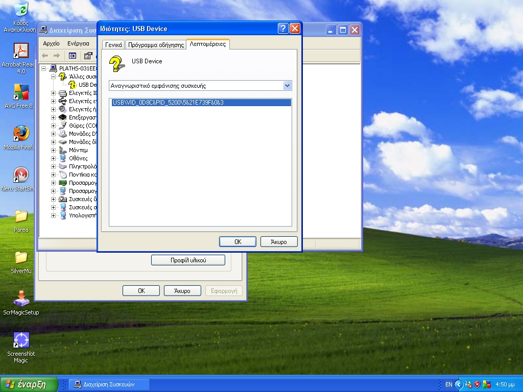 plaths Δημοσ. 14 Απριλίου 2009 Μέλος Δημοσ. 14 Απριλίου 2009 Αν είναι USB: Θα πας στο Device manager. Λογικά θα στην βλέπει σαν άγνωστη συσκευή. Κάνεις διπλό κλικ πάνω της και πας στις λεπτομέρειες. Μας ενδιαφέρει το PID και το VID. Αν δεν είναι usb πάλι θα υπάρχει κάτι αντίστοιχο για την συσκευή. εμενα αυτο δειχνει.................