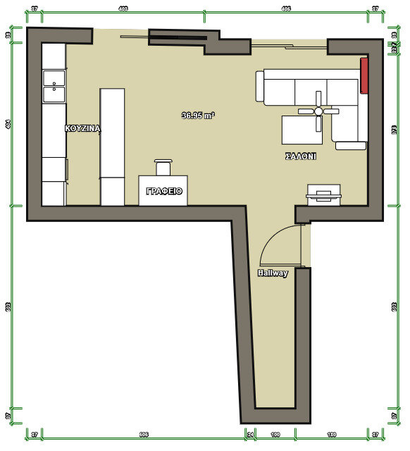 Περίπου 37m², μέτρια προς κακή μόνωση, το βλέπει ο ήλιος αρκετά και έχει ένα hall το οποίο δεν έχει πόρτα.