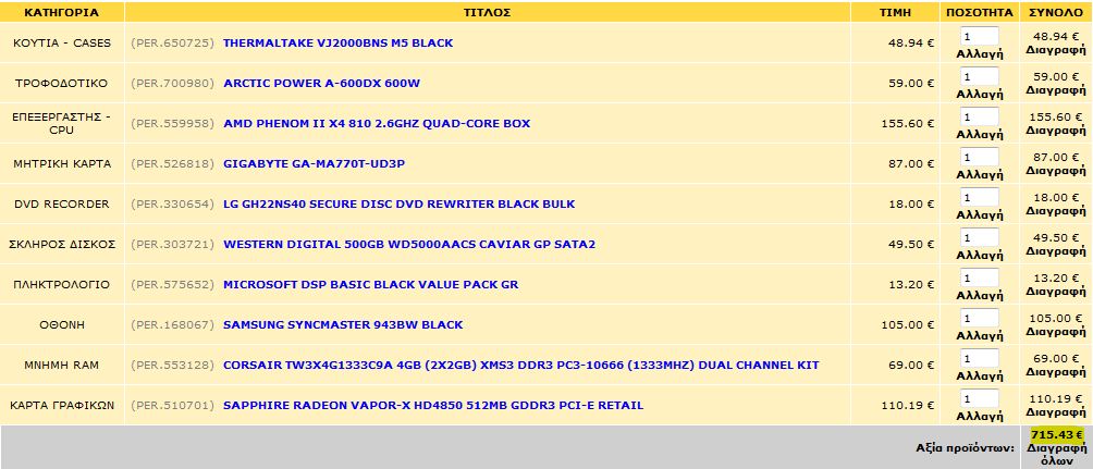 BaNcU Δημοσ. 13 Ιουνίου 2009 Δημοσ. 13 Ιουνίου 2009 Λοιπόν έτσι όπως ήρθανε τα πράματα δεν πρόκειτα να φτιάξεις ένα "τούρμπο" κουτί αλλά κάτι καλό. Επεξεργαστή σου έβαλα τον φρέσκο, οικονομικό 550, κάρτα γραφικών θα πας 4770 (κλάσεις ανώτερη από την 9400 που έβαλες), μητρική δεν είναι κανένα αξιόλογο κομμάτι, δεν είναι φημισμένη για τις δυνατότητες στο o/c της αλλά την δουλειά της θα την κάνει, 500άρι σκληρό, 22άρα οθόνη, λειτουργικό 64bito (που σου στέρησε καλύτερη κάρτα γραφικών, μητρική, επεξεργαστή) για να αξιοποιεί τα 4 gb ram και τροφοδοτικό που σηκώνει το σύστημα, μην αρχίσεις και λες ότι δεν το σηκώνει !, σαν πολλούς τελευταία. Απλά θα μας διευκόλυνε άμα έπαιρνες λειτουργικό από φίλο/φίλη.