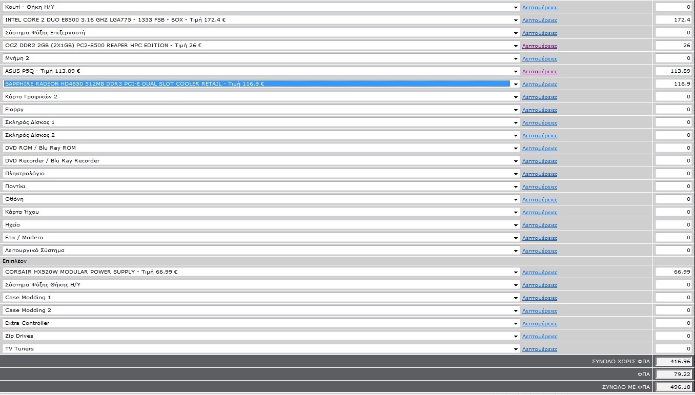 ColdFusion Δημοσ. 27 Ιουνίου 2009 Δημοσ. 27 Ιουνίου 2009 Παρακαλω τη γνωμη σας ΚΟΥΤΙΑ - CASES (PER.809806) NZXT GUARDIAN 921 BLACK 79.40 € ΕΠΕΞΕΡΓΑΣΤΗΣ - CPU (PER.559959) AMD PHENOM II X3 720 2.8GHZ TRIPLE-CORE BLACK EDITION BOX 122.00 € ΜΝΗΜΗ RAM (PER.553904) KINGSTON KVR1333D3N9/2G DDR3 2GB PC10666 1333MHZ VALUE RAM 26.50 € ΜΗΤΡΙΚΗ ΚΑΡΤΑ (PER.528472) ASROCK M3A780GXH/128M 79.90 € ΚΑΡΤΑ ΓΡΑΦΙΚΩΝ (PER.510701) SAPPHIRE RADEON VAPOR-X HD4850 512MB GDDR3 PCI-E RETAIL 110.19 € ΣΚΛΗΡΟΣ ΔΙΣΚΟΣ (PER.301778) SEAGATE BARRACUDA 7200.12 ST3500418AS 500GB SATA2 51.50 € DVD RECORDER (PER.330654) LG GH22NS40 SECURE DISC DVD REWRITER BLACK BULK 18.00 € ΤΡΟΦΟΔΟΤΙΚΟ (PER.806216) ARCTIC COOLING FUSION 550R 64.95 € Αξία προϊόντων: 578.94 € Ολα απο e-shop..