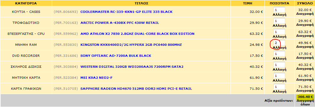 BaNcU Δημοσ. 30 Ιουνίου 2009 Δημοσ. 30 Ιουνίου 2009 Βασικά ναι δεν αξίζει έτοιμο ούτε για έναν λόγο. Δές τι μπορεί να βγεί με 450 ευρώ : COOLERMASTER RC-335-KKN1-GP ELITE 335 BLACK CHIEFTEC CTP-450-12G GREEN SERIES 450W AMD PHENOM II X2 550 3.1GHZ DUAL-CORE BLACK BOX EDITION ASROCK M3A780GXH/128M KINGSTON KVR1333D3N9/2G DDR3 2GB PC10666 1333MHZ VALUE RAM WESTERN DIGITAL WD5000AAKS 500GB SATA2 SAMSUNG SYNCMASTER T200 TRUST DS-3250 WIRELESS OPTICAL MULTIMEDIA DESKSET Σύνολο 448,50 ευρώ
