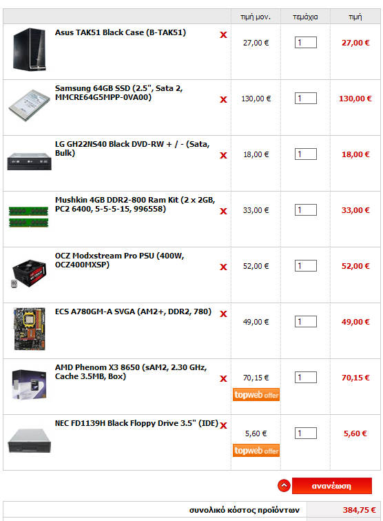 BaNcU Δημοσ. 30 Ιουνίου 2009 Δημοσ. 30 Ιουνίου 2009 Βασικά άμα μπορούσαμε να πάρουμε τα αντικείμενα από e-shop..., θα φτιάχναμε μια καλύτερη σύνθεση σε AM3+DDR3, γεγονός που θα σε ωφελούσε μελλοντικά. Να πάρε ένα παράδειγμα ( χαράς τον κόπο μου ) : http://www.e-shop.gr/show_per.phtml?id=PER.806693 http://www.e-shop.gr/show_per.phtml?id=PER.700633 http://www.e-shop.gr/show_per.phtml?id=PER.559959 http://www.e-shop.gr/show_per.phtml?id=PER.528472 http://www.e-shop.gr/show_per.phtml?id=PER.553904 http://www.e-shop.gr/show_per.phtml?id=PER.303789 Σύνολο 360 ~