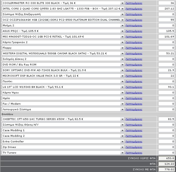 tzouperman Δημοσ. 3 Ιουλίου 2009 Δημοσ. 3 Ιουλίου 2009 Παρακάτω σας παραθέτω μια εικόνα με δικές μου επιλόγες για ένα νέο σταθερό pc μέχρι 800€.Θα ήθελα την άποψή σας για τις επιλογές μου(συμβατότητα και συγxρονισμούς των hardware). Ευχαριστώ εκ των προτέρων!