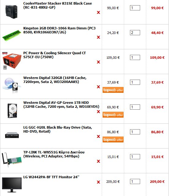 savvas1340 Δημοσ. 21 Ιουλίου 2009 Δημοσ. 21 Ιουλίου 2009 AMD Phenom II X3 720 (sAM3, 2.8 GHz, Cache 7.5MB) MSI 790FX-GD70 OCZ Summit Series 60GB SSD (2.5", SATA II, MLC, OCZSSD2-1SUM60G) Samsung 1TB HDD (32MB Buffer, 7200 rpm, OCZ Platinum EB 2GB DDR3-1600 Ram Kit (PC3-12800, 7-7-6-24, OCZ3P1600EB2GK) X2 XFX HD-489A-ZDD SVGA (PCI-Express, 1GB) CoolerMaster Stacker 831SE Black Case (RC-831-KKN2-GP) Tagan Superrock TG500-U33II PSU (500W) LG W2253V-PF TFT Monitor 21.5'' TOTAL 1173.48