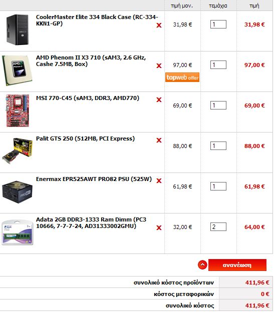 bohemian83 Δημοσ. 19 Αυγούστου 2009 Δημοσ. 19 Αυγούστου 2009 Γεια σας παιδια! Εχω προβλημα και θελω τα φωτα σας. Ο desktop του σπιτιου εχει αρχισει και κανει νερα και πολυ φοβαμαι οτι ειναι στα τελευταια του! Καθως δεν εχει αναβαθμιστει εδω και αρκετα χρονια (εγω εχω το laptop μου, το desk η υπολοιπη οικογενεια) δεν εχω την παραμικρη ιδεα για το τι γινεται στην αγορα και ποια ειναι τα τρεχοντα δεδομενα. Γι' αυτο θα ηθελα να με βοηθησετε να φτιαξω ενα συστημα μεχρι 400 ευρω. Χρειαζομαι κουτι με τροφοδοτικο, μητρικη, επεξεργαστη, μνημη RAM και καρτα γραφικων. O υπολογιστης θα χρησιμοποιειται για web, ταινιες και λιγο για παιχνιδια (οχι οτι πιο βαρυ κυκλοφορει παντως). Περιμενω προτασεις!!