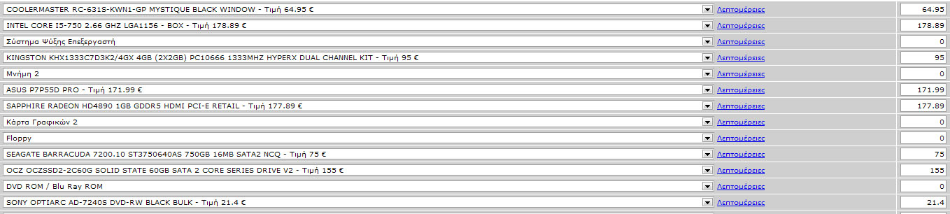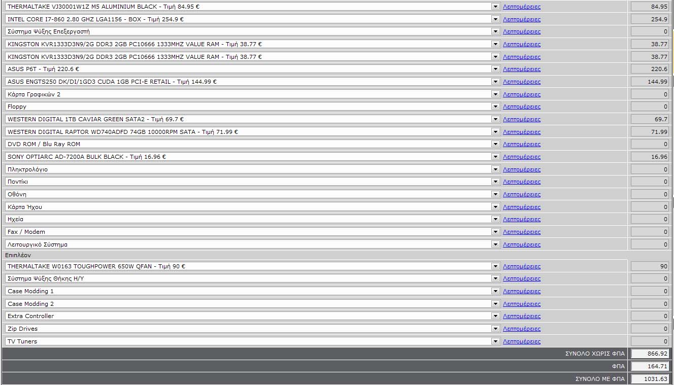 SirD Δημοσ. 23 Σεπτεμβρίου 2009 Δημοσ. 23 Σεπτεμβρίου 2009 Στη συννημένη φότο έχω φτιάξει μια σύνθεση από το e-shop....Το pc προορίζεται για σχεδιαστικά προγράμματα, video editing, παιχνίδια (σε 2η μοίρα...αν μπορεί να παίξει το καινούριο Need for Speed θα είμαι μια χαρά...γενικά δεν παίζω παιχνίδια), και πιο ήπιες συνήθειες, όπως το κατέβασμα αρχείων... Το καλό της υπόθεσης είναι ότι σκέφτομαι να χρησιμοποιήσω την επιδότηση για τους μηχανικούς, οπότε το κόστος θα πάει στο μισό... Προβληματισμοί: 1.Επεξεργαστή πάω σε I7 ή Ι5? 2.Μητρική...αξίζει να δώσεις αυτά τα λεφτά (περίπου 200 €)? 3.Τροφοδοτικό...Είναι αρκετά τα 650W? Για αρχή θέτω τα παραπάνω...ελπίζω μέσα από τη κουβέντα μαζί σας να καταλήξω κάπου...