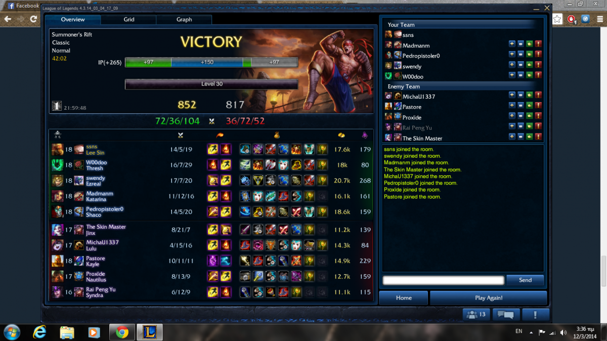 ssns Δημοσ. 12 Μαρτίου 2014 Δημοσ. 12 Μαρτίου 2014 Το αποτελεσμα: Έλα ρε, σιγά το πράγμα.Εγώ είπα να παίξω ένα aram πριν πέσω για ύπνο.Έχω στα τελευταία δέκα παιχνίδια 7 ήττες και με βγάζει με diamon 3, plat 4, gold 1, silver 4 και unranked αντιπάλους.Εμείς silver 5 ο καλύτερος, εγώ unranked για φέτος (πρώην silver 1) και οι λοιποί από 45 έως 295 νίκες.Ε άντε και γανώσου ρε φίλε!Δηλαδή εαν είχα κανα 10/0 σερί με τι θα έπαιζα, μόνος μου με 6 diamond 1; χαχα.Νταξει στο aram εχεις περισσοτερες πιθανοτητες να πεσεις με καλους ενω στα normal ειναι λιγο σπανιο προσωπικα για εμενα που εχω παιξει μεχρι πλατινουμ αντιπαλους