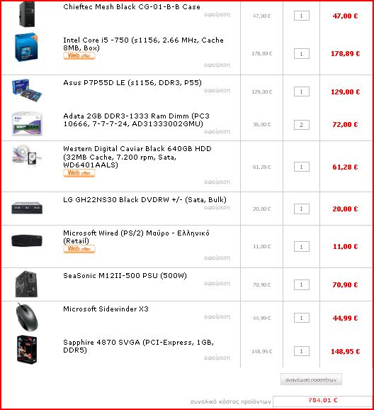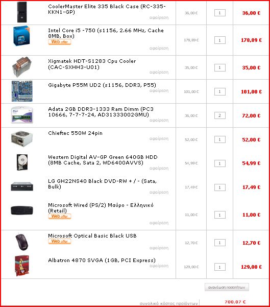 kukukali Δημοσ. 1 Οκτωβρίου 2009 Μέλος Δημοσ. 1 Οκτωβρίου 2009 Εφτιαξα το παρακατω (ευχαριστω ολους για τις υποδειξεις) αλλα ξεφυγα στα ευρω(μεχρι 700)....απο που μπορουμε να κοψουμε τα 85 ευρω εκτος (κολληματα δικα μου)των... Intel Core i5 -750 4870(δεν υπαρχουν λεφτα για καλυτερη)