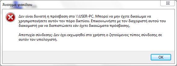 Επισκέπτης Δημοσ. 1 Οκτωβρίου 2009 Δημοσ. 1 Οκτωβρίου 2009 Απ' τα Windows 7 εντοπίζω τον άλλον υπολογιστή αλλά μόλις πάω να συνδεθώ μου βγάζει το εξής μήνυμα που βλέπετε στην εικόνα παρακάτω. Τι πρέπει να κάνω γι' αυτό; Απ' τον υπολογιστή με τα Vista δεν μπορώ να εντοπίσω τον άλλον υπολογιστή.
