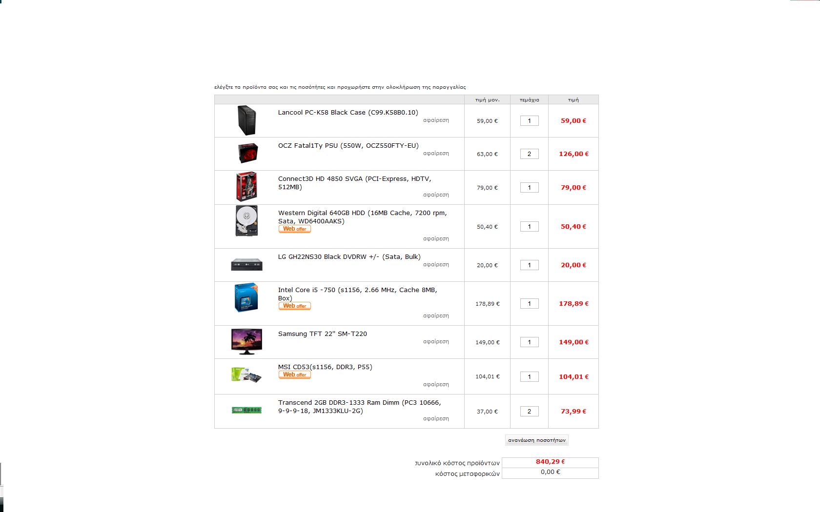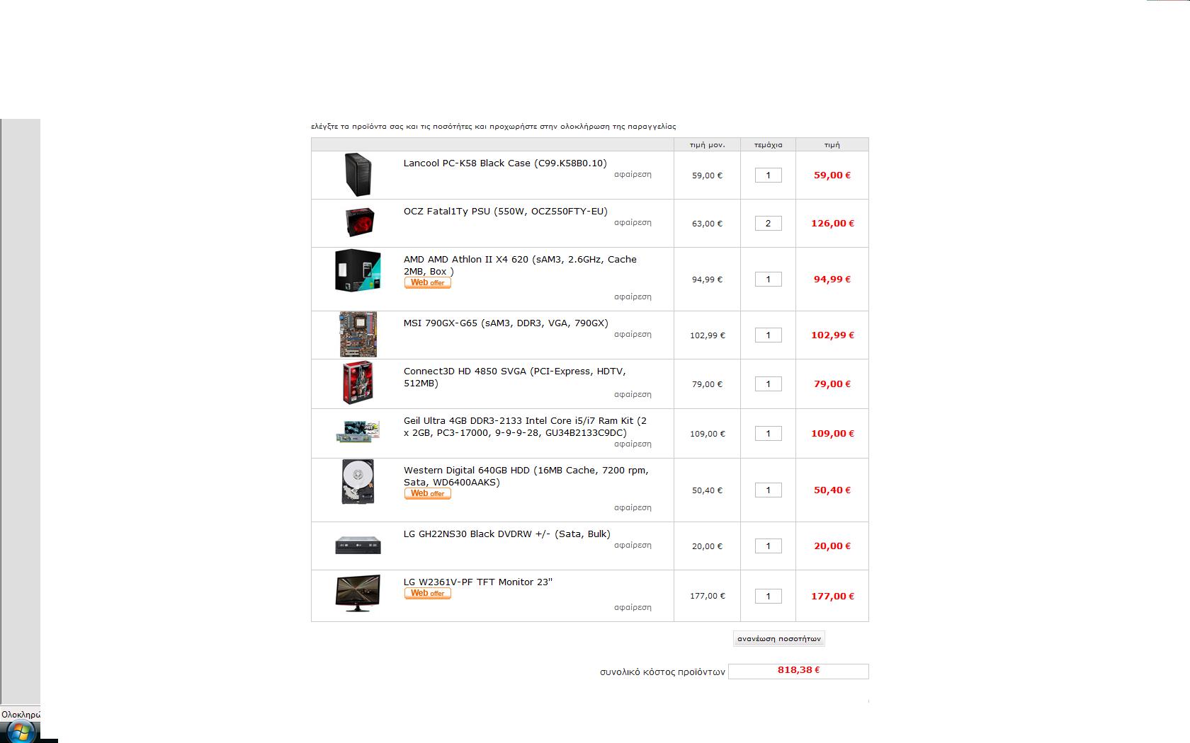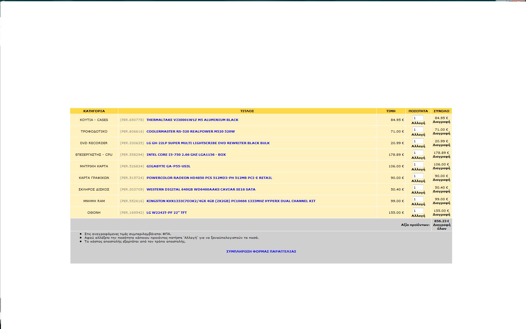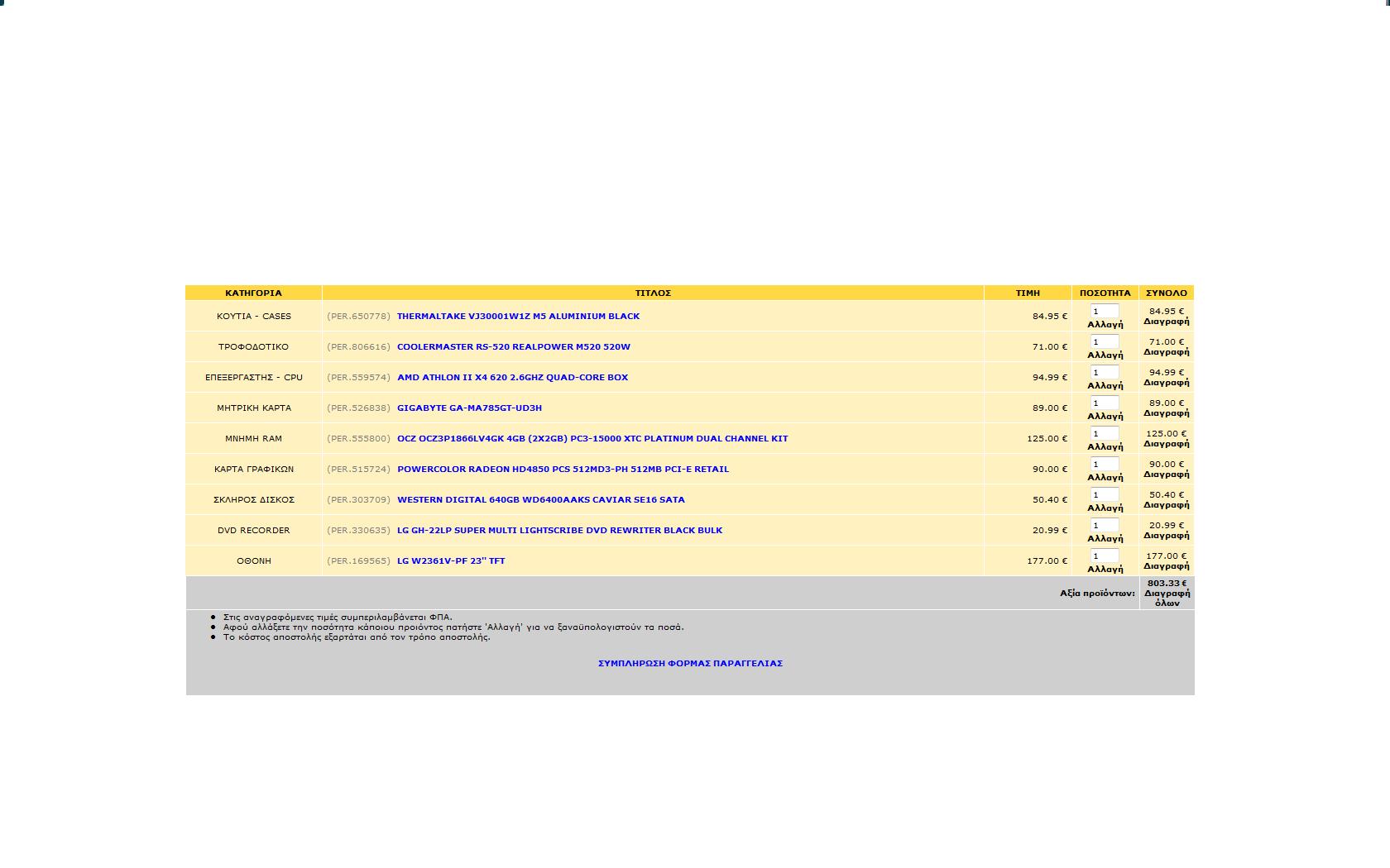 val007 Δημοσ. 14 Οκτωβρίου 2009 Δημοσ. 14 Οκτωβρίου 2009 Lancool PC-K58 Black Case (C99.K58B0.10) http://www.plaisio.gr/Computers/Hardware/PC-Cases/Lancool-PC-K58-Black-Case-C99-K58B0-10-C99-K58B0-10.htm PC Power & Cooling Silencer PPCS500-EU PSU (500W) http://www.plaisio.gr/Computers/Hardware/PSU/PC-Power-Cooling-Pcp-C-500W-Silencer-PPCS500-EU.htm Asus M4A785TD-V EVO (AM3, DDR3, 785, VGA, 90-MIBAC0-G0EAY0KZ) http://www.plaisio.gr/Computers/Hardware/Motherboards/Asus-M4A785TD-V-EVO-AM3-DDR3-785-VGA-90-MIBAC0-G0EAY0KZ.htm 2xAdata 2GB DDR3-1333 Ram Dimm (PC3 10666, 7-7-7-24, AD31333002GMU) http://www.plaisio.gr/Computers/Hardware/RAM/Adata-Ddr3-2Gb-Dimm-1333Mhz-AD31333002GMU.htm Western Digital 640GB HDD (16MB Cache, 7200 rpm, Sata, WD6400AAKS)) http://www.plaisio.gr/Computers/Hardware/Hard-Disk-Drives/Western-Digital-Sata-640Gb-Western-16Mb-7200-Rpm-WD6400AAKS.htm Sony AD-7240S-0B DVDRW + / - (Sata 24X, Bulk, Black) http://www.plaisio.gr/Computers/Hardware/Optical-Disc-Drives/Sony-AD-7240S-0B-DVDRW-Sata-24X-Bulk-Black.htm AMD PHENOM II X4 965 HDZ965FBGIBOX 3,4GHz http://www.hardshop.gr/shop/item.asp?itemid=15585&catid=380 POWERCOLOR RADEON HD4890 1GBD5 1GB PCI-E RETAIL http://www.pc1.gr/showitem.php?ID=200202353 Samsung TFT 22'' SM-T220 http://www.plaisio.gr/Peripherals/PC-Monitors/Monitors/Samsung-22-SM-T220.htm ΣΥΝΟΛΟ ΤΙΜΗ 850 ΕΥΡΩ