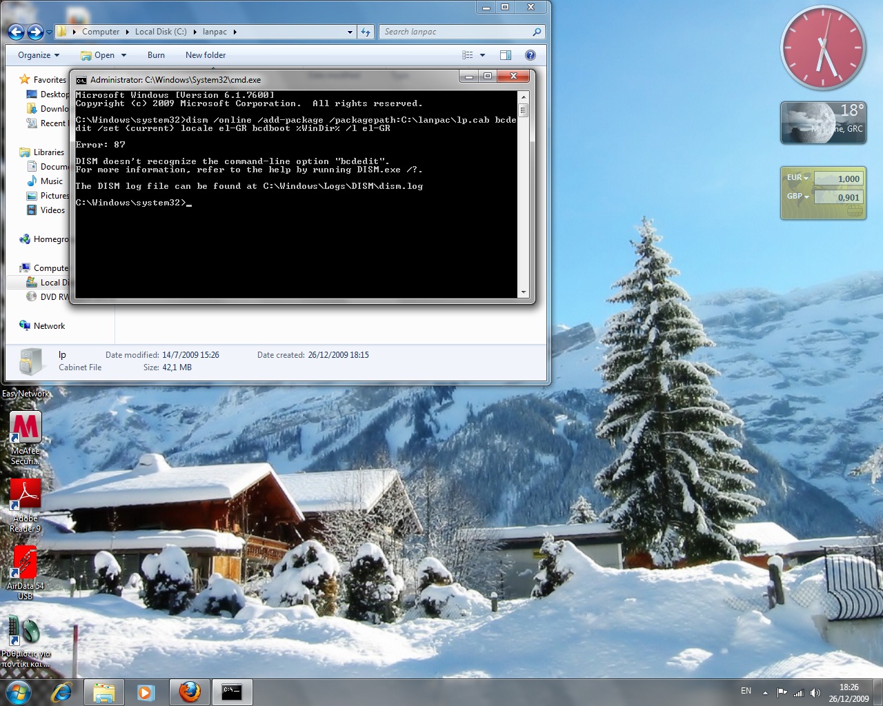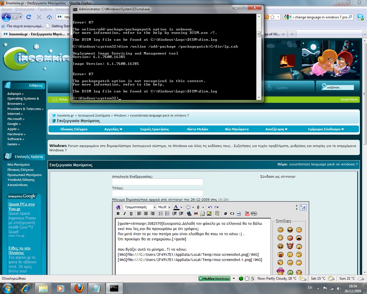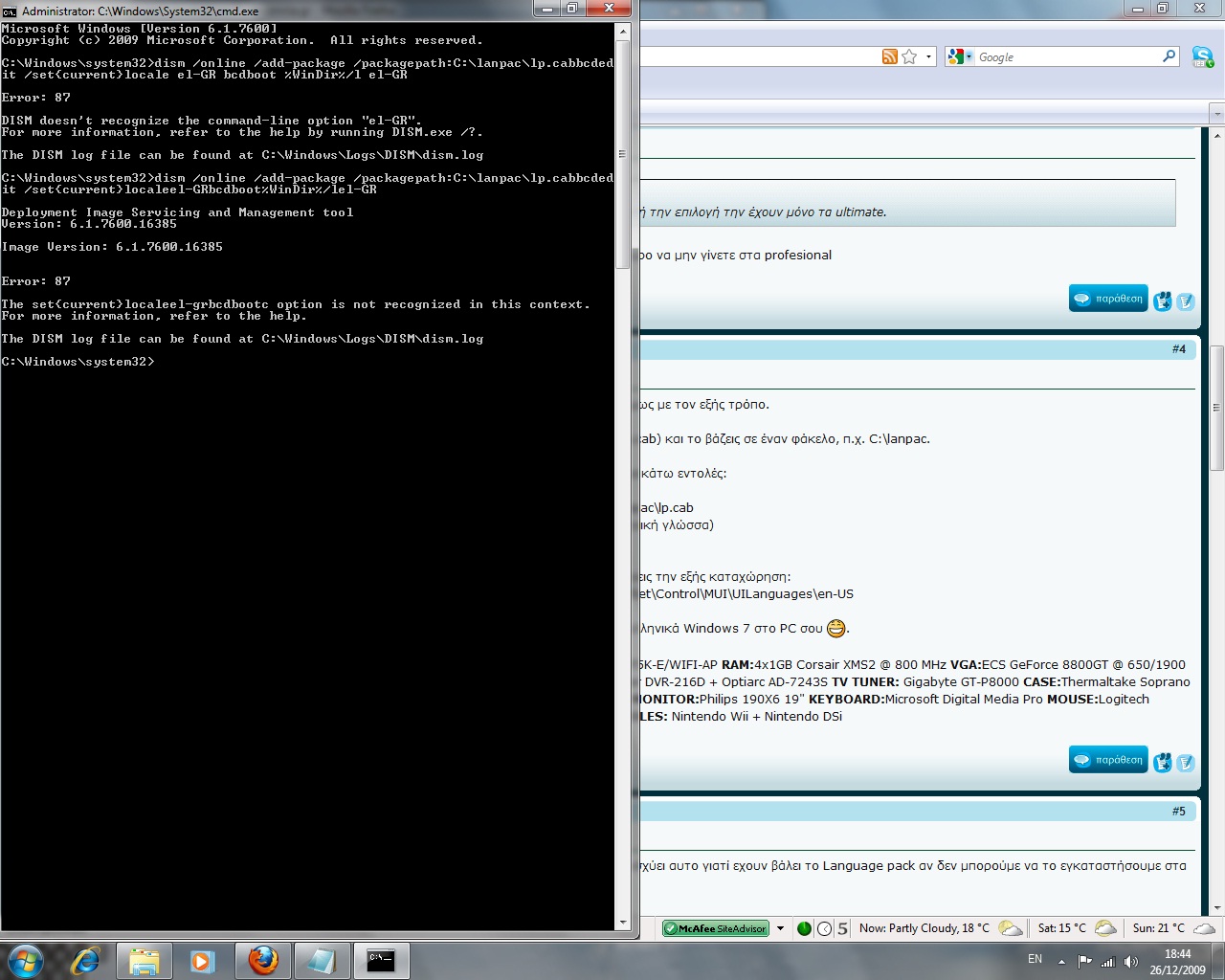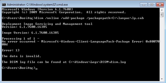 vdanasto Δημοσ. 26 Δεκεμβρίου 2009 Δημοσ. 26 Δεκεμβρίου 2009 Μου βγάζει αυτό το μύνημα..Τί να κάνω; Αυτά που γράφω είναι 3 διαφορετικές εντολές. Δηλαδή γράφεις: dism /online /add-package /packagepath:C:\lanpac\lp.cab πατάς enter μετά bcdedit /set {current} locale el-GR (για την ελληνική γλώσσα) enter και τέλος bcdboot %WinDir% /l el-GR enter Απ'ότι βλέπω τα έγραψες ως μια εντολή
