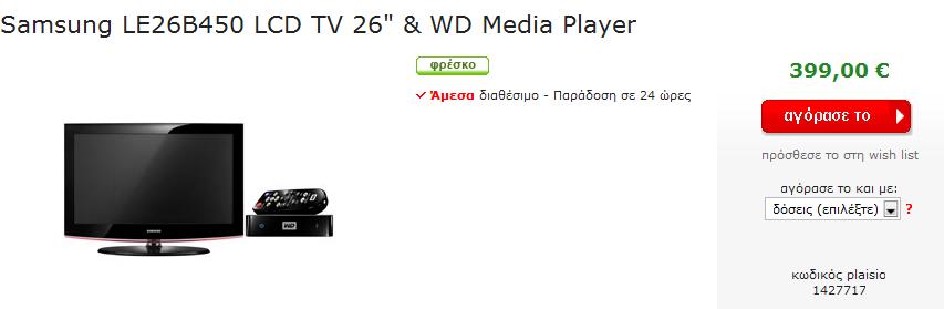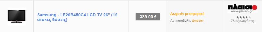 radeon9700 Δημοσ. 12 Δεκεμβρίου 2009 Δημοσ. 12 Δεκεμβρίου 2009 Ποσο την είχε το plaisio βαση το skroutz πριν κάνει update των τιμών, σημείωση ότι την βρίσκεις και με 360 euro !!! http://www.skroutz.gr/s/73793/Samsung-LE26B450-26%2527%2527.html?keyphrase=Samsung+LE26B450 Και ποσο έχει πλέον με την προσφορα και το ... δώρο Πλακα έχει το πλαίσιο