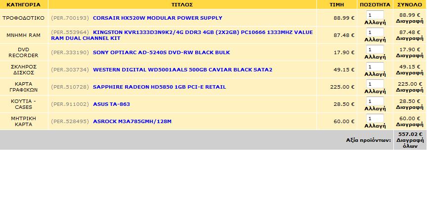 morgoth666 Δημοσ. 17 Δεκεμβρίου 2009 Μέλος Δημοσ. 17 Δεκεμβρίου 2009 Μικρο update, το μονο κομματι που εχω παρει ειναι ο επεξεργαστης. Το πλαισιο μου εριξε ενα Χ μιας και δεν εχει αυτα που παρηγγειλα και δεν ξερει ποτε θα τα φερει... Θα ζητησω λοιπον αλλη μια φορα να μου προτεινετε MoBo+PSU+GPU+μνημες, απο το e-shop αν γινεται και με μπατζετ γυρω στα 400€. GPU ειχαμε καταληξει σε 5770 και για μητρικη ειπαμε να υποστηριζει crossfire και αν γινεται να εχει και e-sata αλλη μια ερωτηση, αν παρω και ενα κουτι και ζητησω συναρμολογηση απο το e-shop, δινουν τα κουτια απο την μητρικη και την καρτα γραφικων? Αυτα και συγγνωμη και παλι για το πρηξιμο αλλα το πλαισιο τον παιρνει, grimpr θελω την βοηθεια σου παλι EDIT: Εκανα μια δοκιμαστικη συνθεση με αυτα που λεω παραπανω+κουτι+εναν σκληρο (με αυτα μεχρι 450€ ειναι το μπατζετ), για πειτε γνωμες. Το stock house του e-shop ειναι αξιοπιστο? Το τροφοδοτικο ειναι λιγο στα τυφλα για να ειμαι ειλικρινης:
