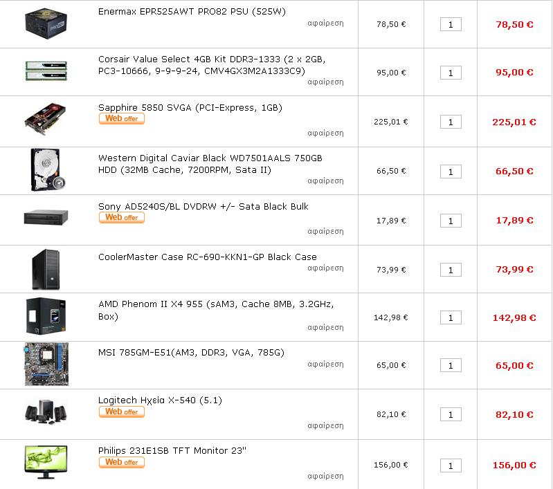 sno0py Δημοσ. 28 Δεκεμβρίου 2009 Δημοσ. 28 Δεκεμβρίου 2009 Καλησπερα παιδια χρονια πολλα! Γιορτες εχουμε και ενα ανηψακι μου(12 χρονων) ετοιμαζεται για το νεο του pc. H xρηση που το θελει ειναι γενικη ξερετε ταινιες ιντερνετ αλλα το θελει και φυσικα για games! Να περιεχει ολα τα μεσα κουτι περιφεριακα κλπ και αν γινεται να εχει αρκετες προπτικες για αναβαθμιση... Eφτιαξα μια συνθεση η οποια βγαινει 1002 ευρω χωρις ποντικι πληκτρολογιο(οποτε αλλα 25 ευρω απο εκει πειτε) Την αποψη σας...