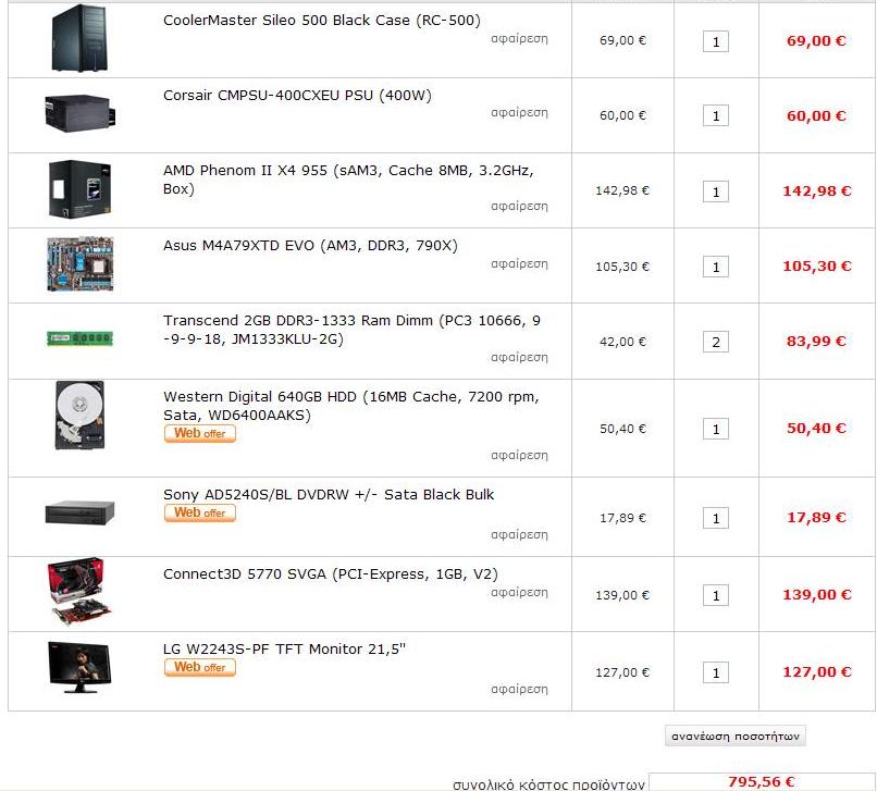 aformes Δημοσ. 30 Ιανουαρίου 2010 Μέλος Δημοσ. 30 Ιανουαρίου 2010 Μετα τα σχολια σας και λιγο ψαξιμο και σε αλλα παρομοια thread εχω καταληξει στο παρακατω συστηματακι με την προσθηκη ενος ssd postville λιγο πιο μετα ωστε να πεσουν λιγο οι τιμες η τουλαχιστον να παμε σε περισσοτερα gb στα ιδια λεφτα Δεν εχω βαλει καρτα γραφικων γιατι ειμαι ασχετος στο τι παιζει με αυτες καθως και ψυκτρα για cpu και σε αυτα τα 2 θα ηθελα τις προτασεις σας για να γινει αμεσα η παραγγελια. Οπως ειπα και στο πρωτο μου post δεν παιζω παιχνιδια περα απο football manager και κανενα pro και θα θετω σαν μπατζετ τα 700 ευρω, δλδ 112 ευρω για καρτα γραφικων και cooler. Περιμενω τις προτασεις σας και αν υπαρχει και καποιο σχολιο για να βγει καλυτερο το συστημα παντα καλοδεχουμενο