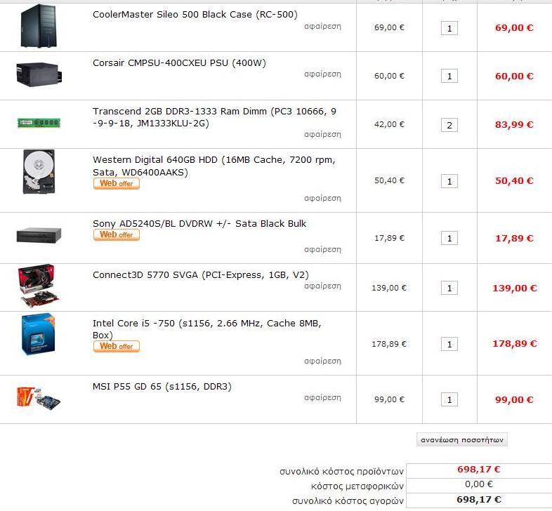 aformes Δημοσ. 3 Ιανουαρίου 2010 Δημοσ. 3 Ιανουαρίου 2010 Νομιζω εφτασε πλεον ο καιρος να αφησω το P4 συστηματακι μου και να περασω σε κατι νεο. Οχι πως δε με καλυπτει καθως απο παιχνιδια μονο football manager παιζω αντε και κανα προ. Απλα μια στα 5 χρονια παιρνω ενα νεο μηχανημα με προοπτικη σχεδον 5ετιας παντα. Εχουμε και λεμε λοιπον... Budget τα 750 μαξιμουμ. Απο επεξεργαστη εδω εχω καταληξει INTEL CORE I7-860 2.80 GHZ LGA1156 - BOX http://www.e-shop.gr/show_per.phtml?id=PER.558293 Και για μνημες λεω αυτες GEIL GE34GB1333C9DC DDR3 4GB (2X2GB) PC3-10666 EVO ONE DUAL CHANNEL KIT http://www.e-shop.gr/show_per.phtml?id=PER.553051 Συνολικα 360 ευρω. Απο εκει και περα θελω τη βοηθεια σας για τα υπολοιπα, ειδικα για καρτα γραφικων γιατι ειμαι ασχετος. Δεν παιζω παιχνιδια οπως ειπα οποτε δε χρειαζεται να παμε σε κατι υπερβολικο Αυτα που εχω σκεφτει εγω ειναι τα παρακατω Κουτι THERMALTAKE VI4000BWS M9D WINDOW BLACK http://www.e-shop.gr/show_per.phtml?id=PER.650733 Τροφοδοτικο THERMALTAKE W0143 PUREPOWER RX 550W CABLE MANAGEMENT http://www.e-shop.gr/show_per.phtml?id=PER.650642 Μητρικη MSI P55M-GD45 http://www.e-shop.gr/show_per.phtml?id=PER.523207 Cooler ARCTIC COOLING FREEZER 7 LP http://www.e-shop.gr/show_per.phtml?id=PER.650135 Δισκος WESTERN DIGITAL WD7500AADS 750GB CAVIAR GREEN SATA2 http://www.e-shop.gr/show_per.phtml?id=PER.303614 Με αυτα παμε στα 665 + 20 ενα dvdr = 685 και μενουν 65 για καρτα γραφικων. Αν σας φαινεται καλο το πακετο καντε καμμια προταση για καμμια καρτα γραφικων η πειτε μου τι θα μπορουσα να αλλαξω για να βγει κατι καλυτερο με αυτα τα λεφτα. Απλα να πω οτι κουτι εβαλα το συγκεκριμενο γιατι εχει εξοδο esata στην προσοψη που θα με βολεψει για τον εξωτερικο σκληρο