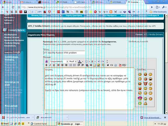 kyuss80 Δημοσ. 10 Ιανουαρίου 2010 Δημοσ. 10 Ιανουαρίου 2010 Χαίρετε, μετά από διάφορες αλλαγές drivers & configuration που έκανα για να καταφέρω να συνδέσω το laptop (FS Amilo 1667g) με την TV δημιουργήθηκε το εξής πρόβλημα: μπλέ κάθετες γραμμές στην οθόνη (επισυνάπτω σχετικό screenshot), χαμηλή ανάλυση και ενίοτε μύνημα για πρόβλημα με το ati2dvag.dll Έψαξα να βρω λύση στο τελευταίο (υπάρχουν κάποια fix σε forum), αλλά δεν έγινε τίποτε. Έχω κάνει update τους drivers επίσης. Help please! Thanks in advance! 1.zip