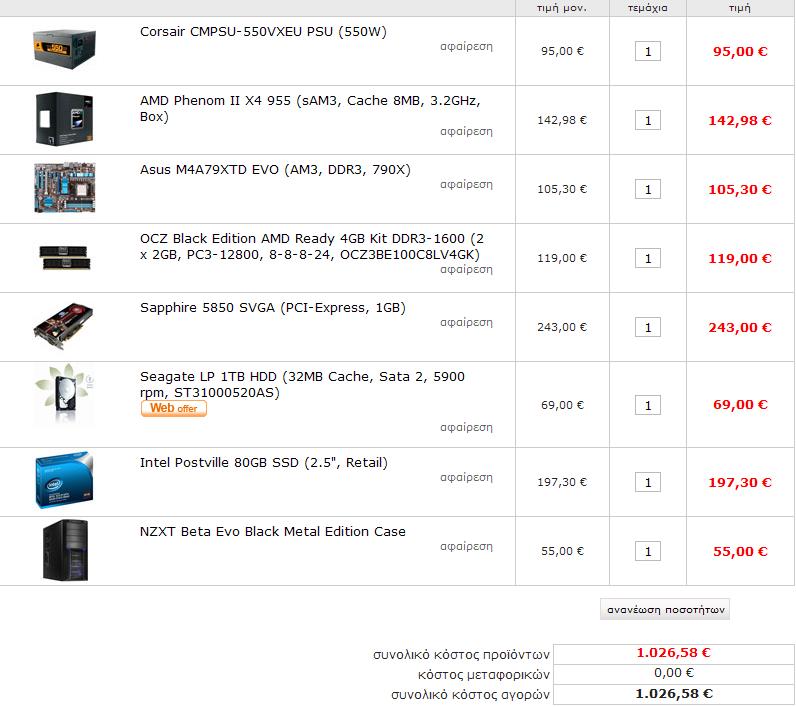 shinigami Δημοσ. 12 Ιανουαρίου 2010 Μέλος Δημοσ. 12 Ιανουαρίου 2010 Μαλιστα ..οποτε οι αλλαγες μου θα ειναι οι εξης: Mobo: http://www.plaisio.gr/ProductPreview.aspx?ref=b2o&Product=1309900 PSU: http://www.plaisio.gr/Computers/Hardware/PSU/Corsair-550W-CMPSU-550VXEU.htm Ram: http://www.plaisio.gr/ProductPreview.aspx?ref=b2o&Product=1352067 Tην καρτα γραφικων θα την παρω απο το πλαισιο τελικα τιν 344ευρω Το case παιζει τοσο σημαντικο ρολο ?? Οο Απλα θα το ηθελα λιιιιγο πιο στιλατο εξωτερικα (καλα αυτο ειναι το τελευταιο πραγμα που θα με νοιαζει αλλα.. χD) Kαι κατι τελευταιο,ψυκτρα λετε να χρειαστω για να μην γινει καμια στραβη ή να μεινω ησυχος?? Σας ΥΠΕΡευχαριστω ΟΛΟΥΣ για την βοηθεια και τις συμβουλες σας,Να ειστε καλα