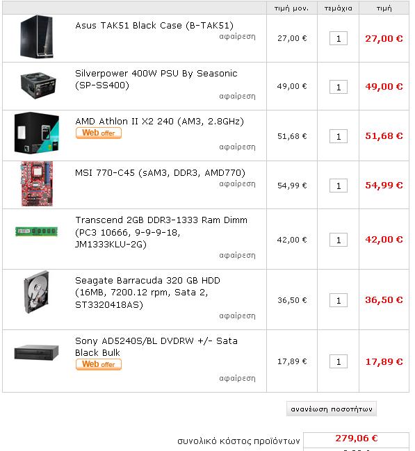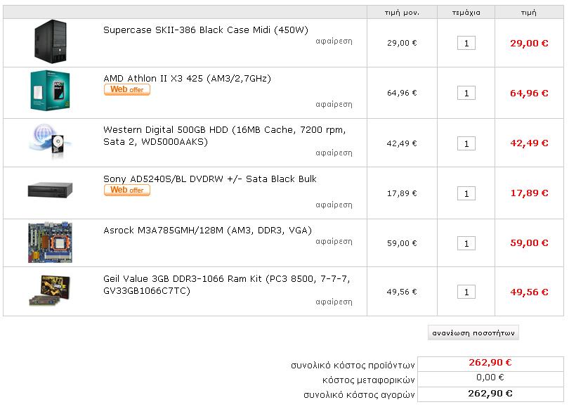 stefanos44 Δημοσ. 26 Ιανουαρίου 2010 Δημοσ. 26 Ιανουαρίου 2010 Καλησπέρα. Αυτό είναι ένα από τα φθηνότερα συστήματα για να κάνετε τη δουλειά σας. Supercase SKII-386 Black Case Midi (450W) 29e Intel Celeron E3300 (s775, 2.5 GHz, 1MB, Box) 39.90e Asrock G41M LE (s775, DDR2, VGA, G41) 42e Mushkin 2GB DDR2-800 Ram Dimm (PC2 6400, 5-5-5-18, 991558) 39e Seagate Barracuda 320 GB HDD (16MB, 7200.12 rpm, Sata 2, ST3320418AS) 36.50e Sony AD5240S/BL DVDRW +/- Sata Black Bulk 17.89e =204.29e Στα 200 και κάτι ευρώ μπορείς να προσθέσεις ή άλλα 2gb μνήμη ή μια GT210 ή ακόμα και να το αφήσεις όπως έχει. Θα είσαι κάτω από 250 σε κάθε περίπτωση. Ζήτα τους να το συναρμολογήσουν - αν θες - και είσαι OK. Εναλλακτικά σε AMD θα έπαιρνα (με DDR3). Asrock M3A785GM-LE/128M (AM3, DDR3, VGA) 59e AMD Athlon II X2 240 (AM3, 2.8GHz) 51.68e Transcend 2GB DDR3-1333 Ram Dimm 42e (κουτί, δίσκος, optical τα ίδια) =236.07 Σε αυτά τα χρήματα μπορείς να προσθέσεις άλλα 2gb μνήμη ή να το αφήσεις όπως έχει.