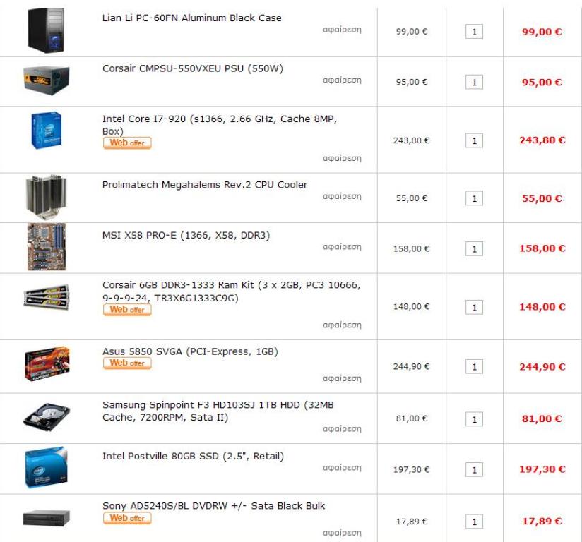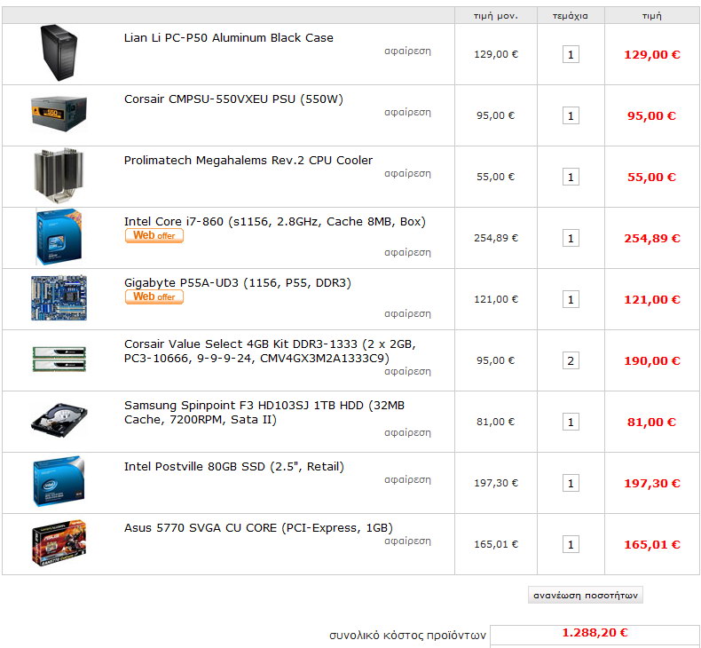 Dropsreef Δημοσ. 31 Ιανουαρίου 2010 Δημοσ. 31 Ιανουαρίου 2010 σου ετοιμασα και εγω μια συνθεση συμφωνα με το budget που ορισες! αν θεωρεις οτι η καρτα γραφικων 5850 ειναι υπερβολικη τοτε πηγαινεις σε μια 5770 και με τα χρηματα που εξοικονομεις(κατι παραπανω απο 100€) βαλε αλλα 6gb ram οθονη χωρις δευτερη σκεψη αυτην η συνολικη συνθεση κοστιζει 1850€ (550€ η οθονη και 1300€ ο πυργος)