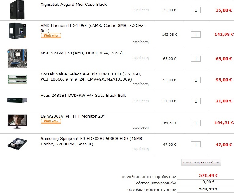 Athanasios2104 Δημοσ. 3 Φεβρουαρίου 2010 Δημοσ. 3 Φεβρουαρίου 2010 Θέλω να κάνω μία αναβάθμιση στο pc του μικρού μου αδερφού (τον έχω ~5 χρόνια με Prescott ) να μπορεί να παίζει τα παιχνίδια με γραφικά της προκοπής. Το σύστημα που έχω συνθέσει προς το παρόν είναι το εξής: AMD Phenom II X4 955 (140e) Cpu cooler ( ??? ) Asus M4A79XTD Evo (105e) Corsair 4GB ddr3 XMS3 (95e) Seagate 320GB (30e) Akasa Freedom Xone (50e) LG W2271TC-PF 22’’ (180e) Windows 7 Home Premium 64bit (100e) Σύνολο: 700e Κάρτα γραφικών θα του βάλω την 4870 που έχω και τροφοδοτικό ένα Zalman 650HP που επίσης έχω. Και επειδή το παλιό μηχάνημα θα το δώσω, τελικό κόστος θα βγει περίπου 350e. Γενικά εκεί θέλω να του βγει τελικά η αναβάθμιση, κάτω από 400e. Για cpu cooler, στους AMD sAM3 μπερδεύτηκα λίγο, κάπου διάβασα ότι οι AM2 ψύχτρες μπαίνουν και σε AM3, αληθεύει; Γενικά χρειάζεται 3rd party cooler ο 955; Τρελό overclocking δεν σκοπεύω να του κάνω, μπορεί και καθόλου, μόνο να είναι πιο αθόρυβη από την stock και να δίνει καλύτερες θερμοκρασίες (αν και δεν ξέρω πως τα πάει η stock, άλλα υποθέτω είναι όπως όλες οι stock). Κάτι Xigmatek που έχει το ΠΛΑΙΣΙΟ έχουν πλαστικά pins, να μου λείπουν (speaking from experience), χιλιες φορές βίδες. H μητρική είναι μία φτηνή σχετικά, είδα ότι φοράει 790Χ άλλα δεν ξέρω τι διαφορά παίζει με το 790FX, αν είναι για θέμα overclocking, τότε δεν υπάρχει πρόβλημα. Δέχεται μέχρι 1600MHz μνήμες, οι Corsair που έβαλα είναι 1333. Επίσης την οθόνη την βρήκα τυχαία, βασικά πρέπει να είναι 22'' wide, dvi, 1680x1050 και με εγγύηση καμμένων pixels, max 180e... δηλαδή αυτήν η LG φαίνεται κομπλέ, άλλα αν υπάρχουν και άλλες επιλογές, just say it. Ακούω απόψεις