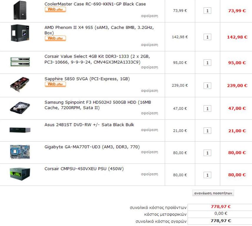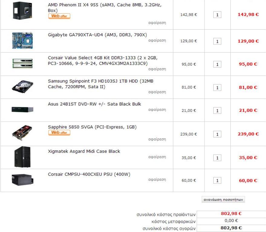 Dropsreef Δημοσ. 6 Φεβρουαρίου 2010 Δημοσ. 6 Φεβρουαρίου 2010 παρατηρηση 1η:750watt τροφοδοτικο οταν σου χρειαζονται το πολυ 300watt?για ποιον λογο? παρατηρηση 2η:απο επεξεργαστη προτιμησε τον AMDPhenom II X4 955 καθως αν δεν κανω λαθος ο επεξεργαστης που σου προτεινε ο φιλος οριον ειναι ενας κλοκαρισμενος 955 παρατηρηση 3η:το κουτι ειναι και θεμα τι μας αρεσει στο ματι αλλα με αυτα τα χρηματα μπορεις να βρεις πολυ ποιοτικοτερα κουτια παρατηρηση 4η:ο σκληρος δισκος που διαλεξες δεν ειναι και ο καταλληλοτερος για να εγκαταστησεις πανω του λειτουργικο συστημα αν ασχολεισαι με παιχνιδια γενικοτερα και εχεις και την αναλογη καλη οθονη βαλε μια 5850,αν οχι τοτε μια 5770 αρκει σου ετοιμασα μια συνθεση με το corsair 400watt!αν για καποιο λογο αισθανεσαι ανασφαλεια τοτε παρε corsair στα 550watt και εισαι υπερκαλυμμενος!(γενικοτερα απο θεμα τροφοδοτικου να προτιμας κυριως corsair και enermax καθως θεωρουνται τα ποιοτικοτερα) και οπως σου ειπα αν η 5850 σου φαινεται υπερβολικη βαλε μια saphire 5770