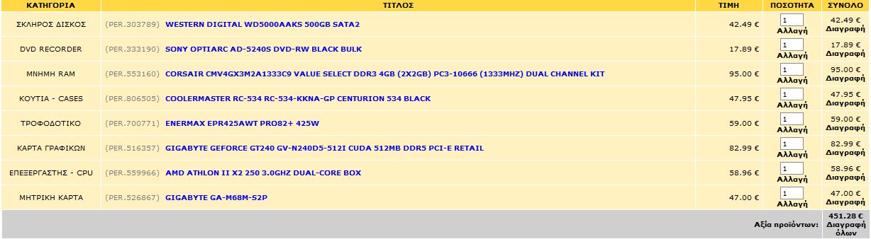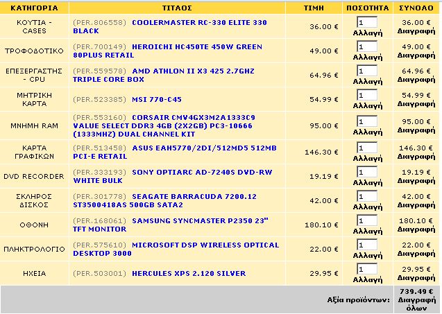 caution Δημοσ. 10 Φεβρουαρίου 2010 Δημοσ. 10 Φεβρουαρίου 2010 @ 610€ παίζει το παρακάτω http://www.e-shop.gr/show_per.phtml?id=PER.169560&u=LG-W2253TQ-PF-22---TFT-PIANO-BLACK http://www.e-shop.gr/show_per.phtml?id=PER.651103&u=THERMALTAKE-VL80001W2Z-V3-BLACK-EDITION http://www.e-shop.gr/show_per.phtml?id=PER.650592&u=THERMALTAKE-W0148-PUREPOWER-RX-400W http://www.e-shop.gr/show_per.phtml?id=PER.523216&u=MSI-770-G45 http://www.e-shop.gr/show_per.phtml?id=PER.559578&u=AMD-ATHLON-II-X3-425-2.7GHZ-TRIPLE-CORE-BOX http://www.e-shop.gr/show_per.phtml?id=PER.553568&u=APACER-DDR3-2GB-PC10600-1333MHZ-GOLDEN-COVER ( αργότερα κουμπώνεις και μια δεύτερη ) http://www.e-shop.gr/show_per.phtml?id=PER.519705&u=XFX-RADEON-HD5750-512MB-HD-575X-YHF-PCI-E-RETAIL http://www.e-shop.gr/show_per.phtml?id=PER.301778&u=SEAGATE-BARRACUDA-7200.12-ST3500418AS-500GB-SATA2 http://www.e-shop.gr/show_per.phtml?id=PER.330654&u=LG-GH22NS40-SECURE-DISC-DVD-REWRITER-BLACK-BULK http://www.e-shop.gr/show_per.phtml?id=PER.651006&u=FLOPPY-DISK-DRIVE-3.5--BLACK και είσαι μια χαρά για ότι περιγράφεις, με το παραπάνω