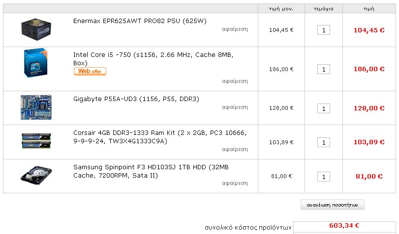 panchociv Δημοσ. 11 Μαρτίου 2010 Μέλος Δημοσ. 11 Μαρτίου 2010 μητρικη:GIGABYTE GA-P55A-UD3R 133,60€(η αντιστοιχη στο πλαισιο κανει 148€,ριξε μια ματια να δεις τα χαρακτηριστικα της) τροφοδοτικο:CORSAIR CMPSU-550VX 550W 74,65€ επεξεργαστης:Intel Core i5 -750 186€ σκληρος δισκος:Samsung Spinpoint F3 HD103SJ 1TB HDD 81€ μνημες ram:Corsair Value Select 4GB Kit DDR3-1333 94.94€ εκτος αν ασχοληθεις σοβαρα με o/c Mushkin Redline 4GB DDR3-1600 Ram Kit 129€ Συνολικο κοστος 570€ ή 604€(εξαρταται απο τις μνημες) Ευχαριστώ κατ'αρχάς για την άμεση απάντηση. Ξέρω πως το pc1 έχει γενικά καλύτερες τιμές, αλλά για να είμαι ειλικρινής, το φοβάμαι λίγο όσον αφορά τις εγγυήσεις . . . (ειδικά εδώ στην επαρχία . . .) - Θεωρείς το τροφοδοτικό που έβαλα "to much" (με βάση αυτά που έγραψα στο post #1), ή το κάνεις για το budget ? - Θα πρότεινες κάποια άλλη εταιρεία Μ/Β ? - Θα μπορούσαμε να έχουμε καλύτερο σύστημα σε AMD ?