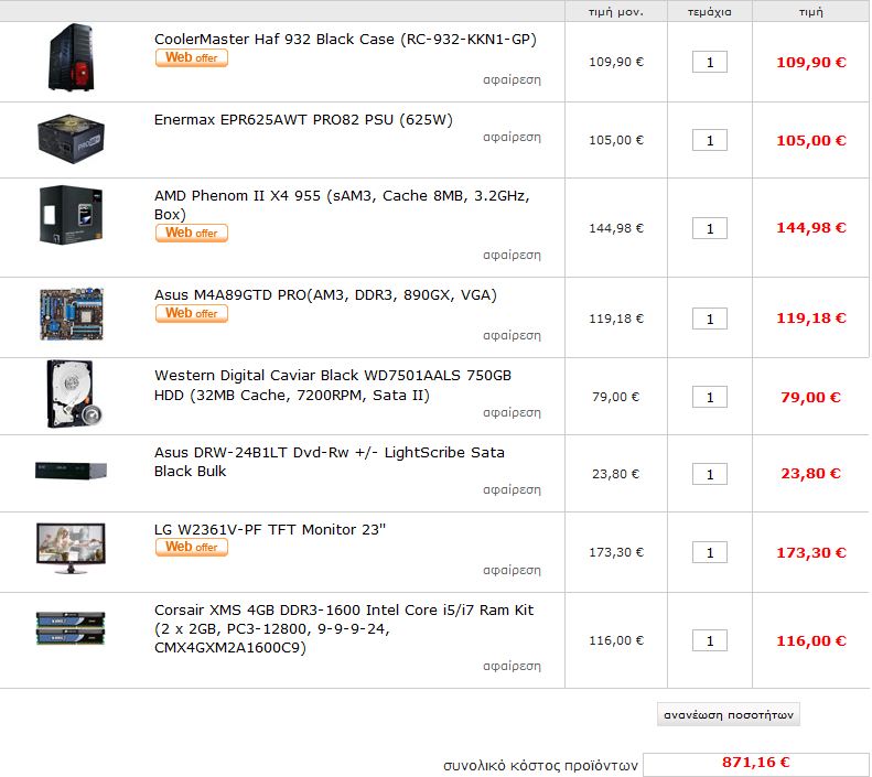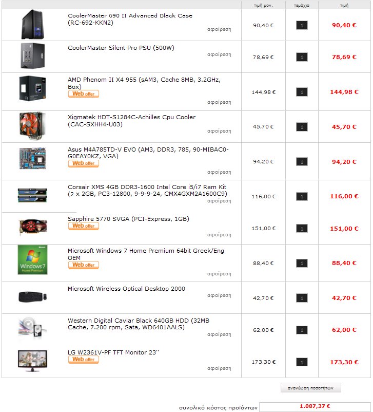 zampONakiaskiou Δημοσ. 11 Απριλίου 2010 Δημοσ. 11 Απριλίου 2010 Λοιπόν ένας φίλος αποφάσισε να πάρει ένα καινούριο pc γύρω στα 1000-1100ευρώ... Το pc προορίζεται για χαλαρή χρήση (chat κτλ κτλ) αλλά και gaming!Δεν έχει τεράσστιες απαιτήσεις βέβαια απλά να παίζει χαλαρά MW2 και κανα Pro.. Έφτιαξα λοιπόν μια σύνθεση και ζητάω γνώμες... Ο πύργος θα γίνει παραγγελία εξολοκλήρου από πλαίσιο για να γλυτώσουμε τη συναρμολόγηση.. Για οθόνη δεν το έψαξα σχεδόν καθόλου, οπότε αν υπάρχει κάτι καλύτερο στα ίδια λεφτά περίπου από αλλού δεν υπάρχει πρόβλημα..
