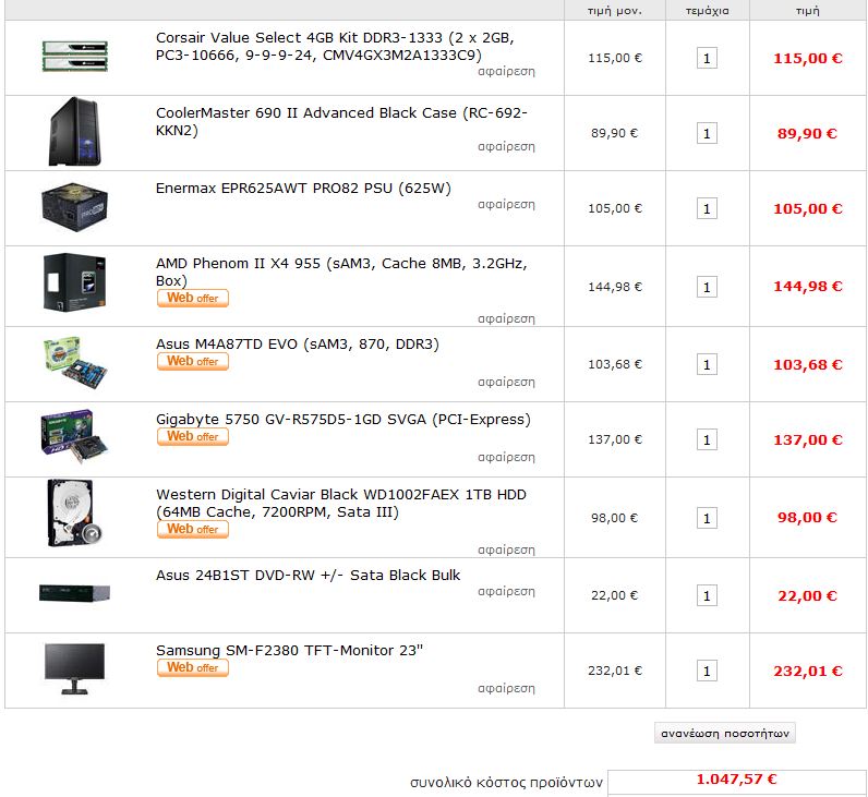 caution Δημοσ. 12 Μαΐου 2010 Δημοσ. 12 Μαΐου 2010 Πάρε την asrock που παραθέτεις - είναι άψογη αγορά και μετά: http://www.winshop.gr/product_review.php?s=aRQKwg http://www.plaisio.gr/Computers/Hardware/RAM/OCZ-Black-Edition-Ready-4GB-DDR3-1600-Ram-Kit-PC3-12800-7-7-7-24-OCZ3BE1600LV4GK.htm http://www.plaisio.gr/Computers/Hardware/Hard-Disk-Drives/Samsung-Spinpoint-F3-HD103SJ.htm http://www.pc1.gr/showitem.php?ID=200003366