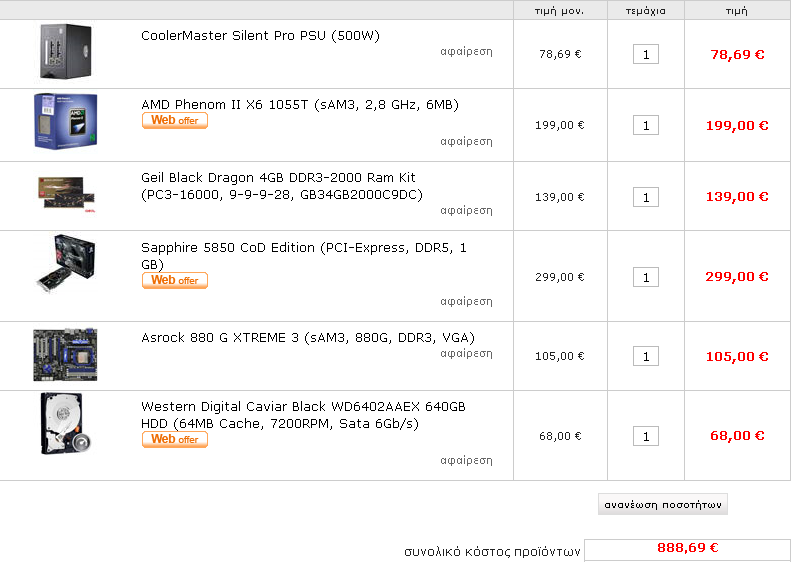 val007 Δημοσ. 25 Μαΐου 2010 Δημοσ. 25 Μαΐου 2010 Samsung 1TB SpinPoint F3 HD103SJ SATA II 7200rpm 32MB http://www.visionstudio.gr/prodinfo.asp?id=17355&cat=6&sub=12&pmanuf=undefined&sort=undefined&step=undefined SAPPHIRE ATI 5850 1GB http://www.e-gate.gr/index.php?dispatch=products.view&product_id=9176 AMD Phenom II X4 955 / 3,2 GHz - Black Edition http://www.e-plaza.gr/index.php?target=products&product_id=34372 Intel Postville 80GB SSD http://www.plaisio.gr/Computers/Hardware/Solid-State-Drives/Intel-Postville-80GB-SSD-2-5inches-Retail.htm συνολο τιμη 1036.5 ευρω αν θελεις AMD Phenom II X6 1055T? εκοψε για λεφτα κουτι,τροφοδοτικα... AMD Phenom II X6 1055T http://www.e-plaza.gr/index.php?target=products&product_id=34366 SHARKOON REBEL9 ECONOMIC http://www.pc1.gr/showitem.php?ID=200007130 HEROICHI HC500TE 500W GREEN 80PLUS RETAIL http://www.pc1.gr/showitem.php?ID=200003362 συνολο τιμη 1037 ευρω..