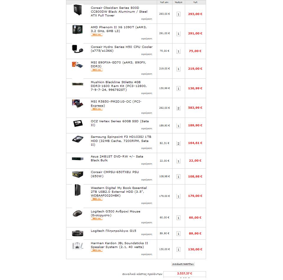 Dropsreef Δημοσ. 27 Ιουνίου 2010 Δημοσ. 27 Ιουνίου 2010 Να ρωτήσω κάτι, αξίζει να μαζέψω τα κομμάτια από διάφορα e-shops για να βρω τις καλύτερες προσφορές, όπως έκανες εσύ ή να τα πάρω όλα από ένα, που σε περίπτωση προβλήματος να μην τρέχω? Από ό,τι βλέπω υπάρχουν διαφορές από μαγαζί σε μαγαζί Εννοειται οτι αξιζει να αγορασεις απο διαφορετικά καταστήματα.Σε ορισμένα προϊοντα η διαφορά σε τιμή ειναι αξιοσημείωτη συγκριτικά με τιμές πλαισιου/e-shop Αν ειναι να δωσει 130 για ηχεια καλυτερα να πει σε monitor λυση η ακομα καλυτερα σε ενα σετ ενισχυτη με 2 2δρομα μικρα Για να είμαι ειλικρινής στην σύνθεση που ετοίμασα πιο πανω εγω προσωπικά θα αγόραζα τα φθηνότερα απο τα προϊοντα που παραθέτω εκτος απο την cpu cooler που θα χτυπούσα την corsair γιατι AMD 1090T και black edition ε θα ηθελα να τον ξεζουμίσω (Οπως το υπολόγισα με τις φθηνότερες επιλογές αλλα με την H50 το κουτι μαζι με τα περιφερειακά-πλην οθόνης-κοστίζει 1640€ ) Και φυσικά απο οθόνη όσο άντεχε η τσέπη μου. Asus Socket AM3 Crosshair IV Formula GLan Audio Raid τιμη 200 ευρω...http://www.visionstudio.gr/prodinfo.asp?id=19215&cat=3 Σωστός φιλε Val007.Σε περίπτωση που τον ενδιαφέρει το crossfire είναι οντως πολύ καλή επιλογή σε πολυ καλή τιμή.(Αν και την προσωπική μου άποψη περι crossfire την εξέφρασα οποτε θα προτιμούσα 890 gx παρά 890FX)