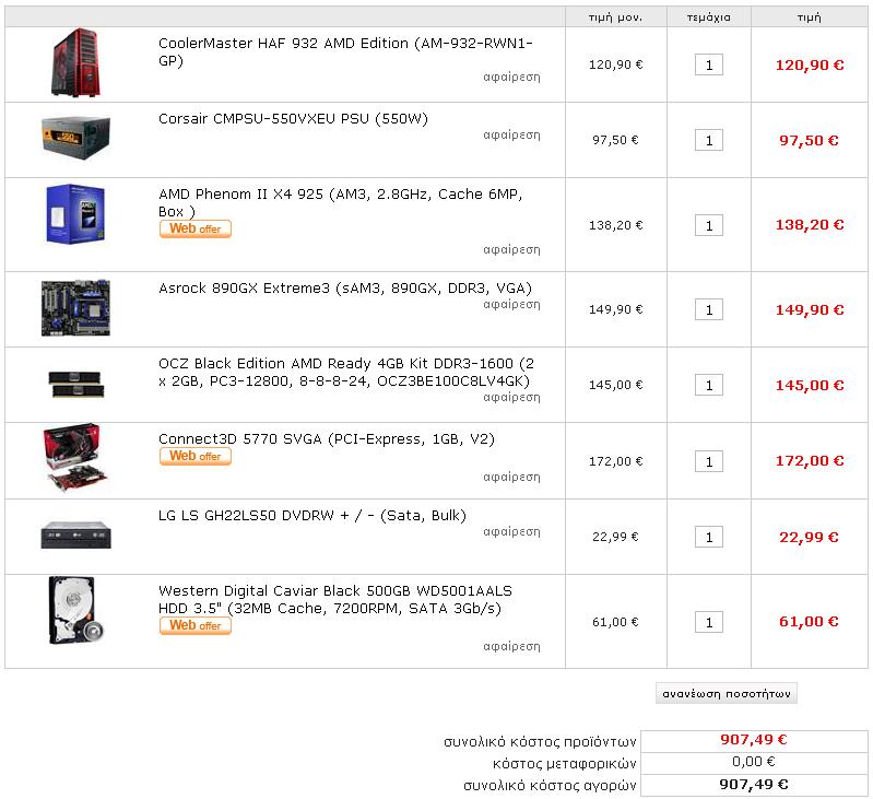 uncle_sam Δημοσ. 7 Ιουλίου 2010 Δημοσ. 7 Ιουλίου 2010 ...για τετοια ανάλυση συνηθως λεω την 5770, αλλα απλα για να δεις τι παιρνεις με 800 € CASE : COOLERMASTER RC-590-KKN1-GP CENTURION 590 MIDI TOWER PSU : CoolerMaster Silent Pro M600 600W PSU (RS-600-AMBA-D3) MOBO : Asrock Socket AM3 880G Extreme3 CPU : AMD Athlon II X3 440 3.0 GHZ RAM : Corsair XMS3 - Xtreme 4GB DDR3 Non ECC CL9 1333MHz (TW3X4G1333C9A) (Kit 2 x 2048 GPU : XFX VGA HD 5850 725M 1GB DDR5 DUAL DVI HDD : Samsung 1TB SpinPoint F3 HD103SJ SATA II 7200rpm 32MB O/D : Asus 24B1ST DVD-RW +/- Sata Black Bulk ΣΥΝΟΛΟ : 782,42 €