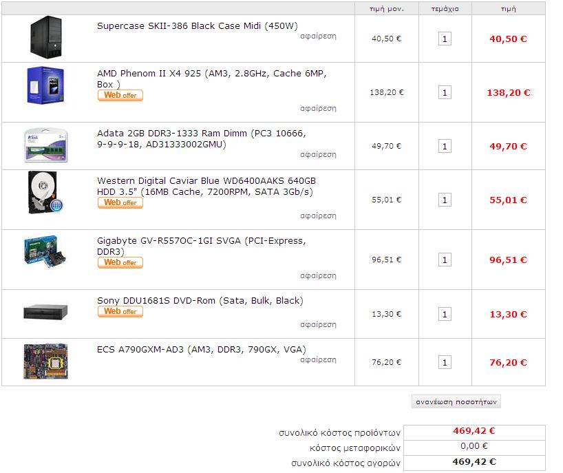 avraam5 Δημοσ. 14 Ιουλίου 2010 Δημοσ. 14 Ιουλίου 2010 αυτα πανω κατω πηρα εγω με το ιδιο budget πριν κανα μηνα περιπου και ειμαι απολυτα ευχαριστημενος: http://www.plaisio.gr/Computers/Hardware/PC-Cases/Supercase-Midi-Black-450W-SKII-386.htm http://www.plaisio.gr/Computers/Hardware/CPU/AMD-Athlon-II-X2-250-sAM3-3GHz-Cache-2MB-Box.htm http://www.plaisio.gr/Computers/Hardware/Motherboards/Asus-M4A78LT-M-LE-AM3-DDR3-760-VGA-90-MIBB90-G0EAY00Z.htm http://www.plaisio.gr/Computers/Hardware/Hard-Disk-Drives/Western-Digital-Caviar-Black-WD1002FAEX-1TB-HDD-64MB-Cache-7200RPM-Sata-III.htm http://www.plaisio.gr/Computers/Hardware/Optical-Disc-Drives/GH22NS50-Black-DVD-RW-plus-Sata22X-Bulk-GH22NS50-AUAU50B.htm http://www.plaisio.gr/Computers/Hardware/SVGA/Connect3D-Pci-E-4850-512Mb-CN-HD4850-512D3E.htm http://www.plaisio.gr/Computers/Hardware/RAM/Adata-Ddr3-2Gb-Dimm-1333Mhz-AD31333002GMU.htm συνολο 421,43 €