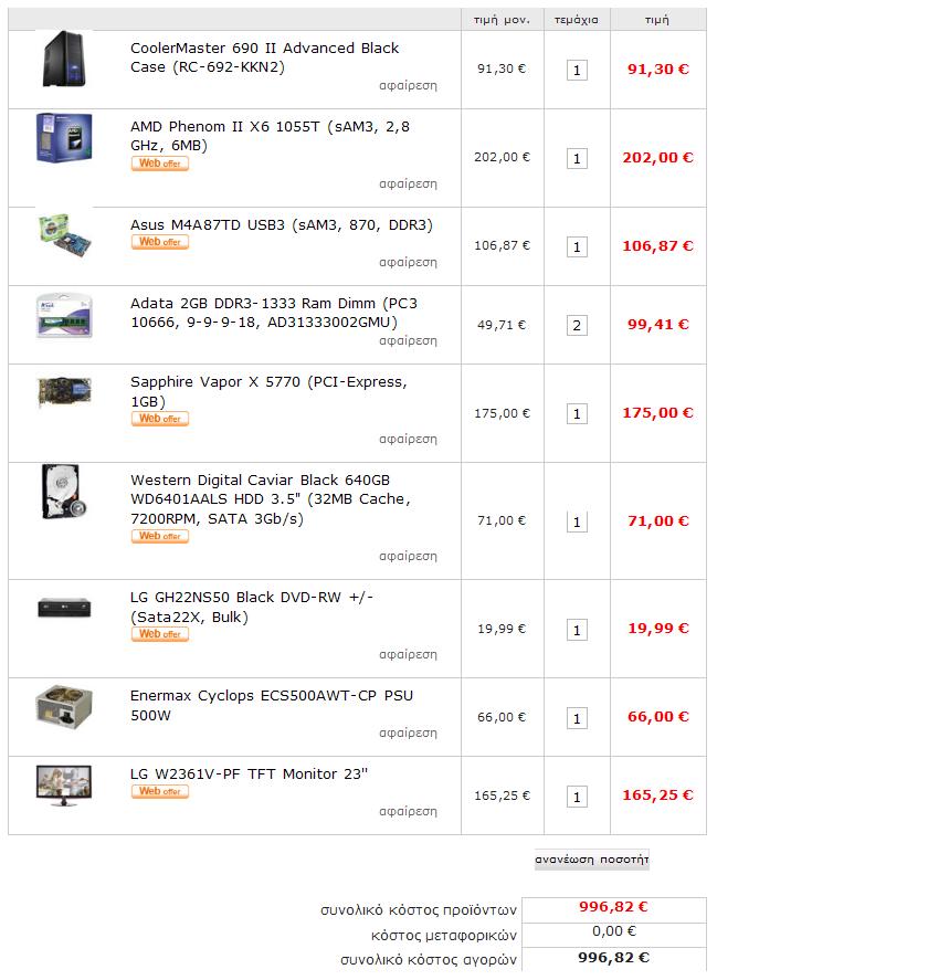roverangas Δημοσ. 19 Ιουλίου 2010 Μέλος Δημοσ. 19 Ιουλίου 2010 παιδια τελικα εκανα μια συμφερουσα επιλογη μεταξυ των 2 αποψεων και παραγγειλα αυτην την συνθεση.. psu -> Enermax Cyclops ECS500AWT-CP PSU 500W case-> CoolerMaster 690 II Advanced Black Case (RC-692-KKN2) mobo-> Asus M4A87TD USB3 (sAM3, 870, DDR3) vga-> Sapphire Vapor X 5770 (PCI-Express, 1GB) ram-> Corsair Value Select 4GB Kit DDR3-1333 (2 x 2GB, PC3-10666, 9-9-9-24, cpu-> AMD Phenom II X6 1055T (sAM3, 2,8 GHz, 6MB) hdd-> WD Caviar Black WD6402AAEX 640GB HDD (64MB Cache, 7200RPM, Sata 6Gb/s) monitor>LG W2361V-PF TFT Monitor 23'' dvdrw-> LG LS GH22LS50 DVDRW + / - (Sata, Bulk) θελω να σας ευχαριστησω για την βοηθεια σας γιατι χωρις εσας σιγουρα θα εκανα καμια γκαφα η θα επεφτα σε καμια λουμπα ψευτοπροσφορας,ααα! τους ζητησα να με κανουν και κανενα δωρο γιατι 1023 ευρω δεν ειναι και λιγα ε?