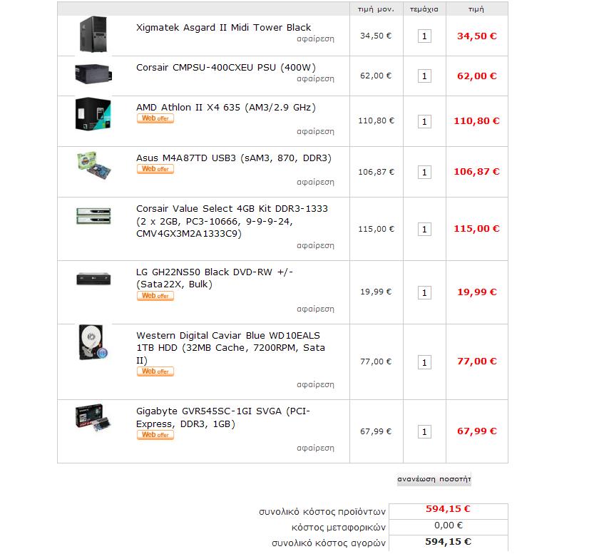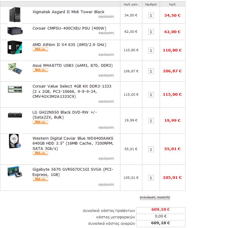 icsd08063 Δημοσ. 19 Ιουλίου 2010 Δημοσ. 19 Ιουλίου 2010 Καλημέρα σας, Μέσα στην εβδομάδα σκοπεύω να αγοράσω ένα νέο υπολογιστή για τις ανάγκες ενός τεχνικού γραφείου. Μετά από μια σχετικά έρευνα, κατέληξα στην συγκεκριμένη σύνθεση: Κουτί: Asus TA-8G1 Black Case Τροφοδοτικό: CoolerMaster Elite Power RS-460-PSAP-J3 460W PSU Επεξεργαστής: Intel Core i3 530 (1156, 2.93GHz, Cache 4MB, Box) Ψύκτρα: CoolerMaster Hyper 212 Plus Cpu Cooler (RR-B10-212P-GP) Μητρική Κάρτα: Gigabyte GA-H55M-USB3 (s1156, DDR3, H55) Μνήμη RAM: 4 X Kingston 1GB DDR3-1333 Ram Dimm (PC3 10600, KVR1333D3N9/1G) Σκληρός Δίσκος: Western Digital Caviar Black WD6402AAEX 640GB HDD (64MB Cache, 7200RPM, Sata 6Gb/s) Κάρτα Γραφικών: Gigabyte 5670 GVR567OC1GI SVGA (PCI-Express, 1GB) Τα χρήματα που μπορούν να διατεθούν είναι αυστηρά μέχρι 600 ευρώ ενώ η σύνθεση περιλαμβάνει μόνο τα παραπάνω εξαρτήματα. Θα ήθελα να μου προτείνετε, αν έχετε, κάποιο καλύτερο εξάρτημα σχετικά με την παραπάνω σύνθεση και γενικότερα να μου πείτε την γνώμη σας. Επίσης, θα ήθελα να με πληροφορήσετε αν γνωρίζετε το κατά πόσο το Πλαίσιο αναλαμβάνει το στήσιμο του υπολογιστή και με τι κόστος. Ευχαριστώ.