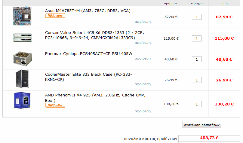 liopyr Δημοσ. 27 Ιουλίου 2010 Δημοσ. 27 Ιουλίου 2010 Δεν είναι λίγα τα 400€, μπορείς να στήσεις αξιοπρεπές σύστημα. Ενδεικτικά το παρακάτω, το οποίο αν skroutz-άρεις και μπορείς να το στήσεις μόνος σου μπορεί να σου βγει φθηνότερο.