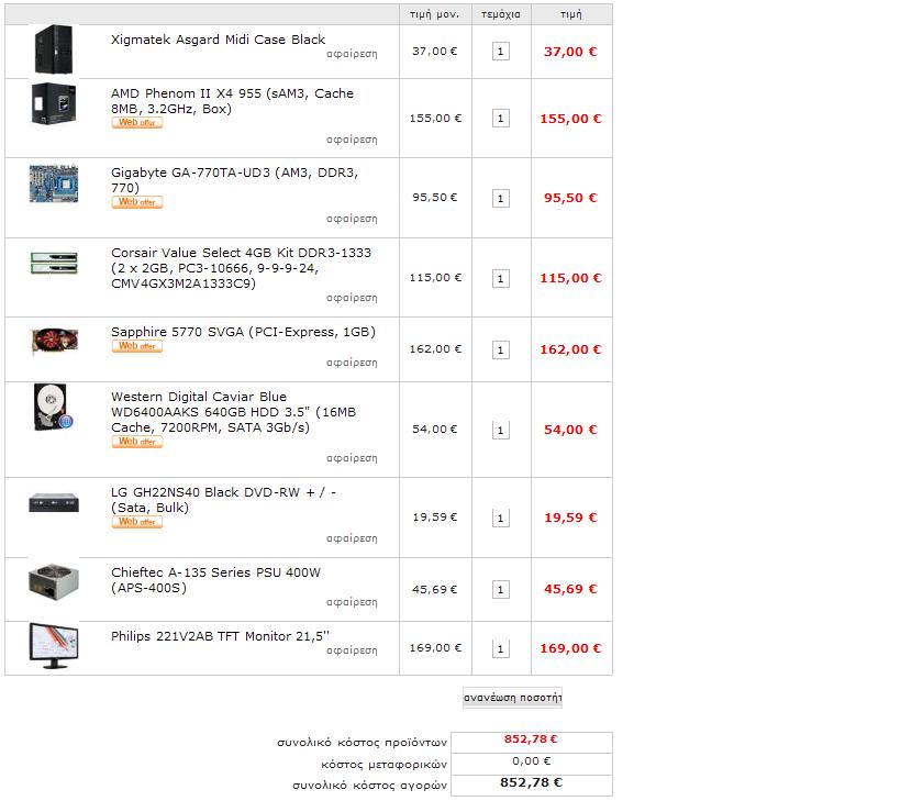 lionheart75 Δημοσ. 23 Αυγούστου 2010 Δημοσ. 23 Αυγούστου 2010 Γεια σας!Επειδή ο τωρινός μου υπολογιστής αρχίζει να μαζεύει υπογραφές για τον "άλλο κόσμο" θα ήθελα την βοήθειά σας για την αγορά ενός νέου υπολογιστή έως 800 ευρώΕπειδή δεν θα κρατήσω τίποτα απο τον παλιό μου υπολογιστή θα ήθελα στην τιμή αυτή να συμπεριλαμβάνονται και τα περιφερειακά κυρίως οθόνη! Ο υπολογιστής θα είναι γενικής χρήσης και θέλω να κρατήσει τουλάχιστον μια 3-4ετία. Πιστεύω πως 600 με 700gb σκληρός δίσκος μου είναι αρκετά γιατί έχω και ένα εξωτερικό δίσκο 1Tb. Ξέχασα να σας πω πως ο χόρος που έχω για την οθόνη είναι σχετικά μικρός και η μεγαλύτερη οθόνη που μπορώ να βάλω ειναι 19 ιντσών..(εκτός και αν γκρεμίσω την βιβλιοθήκη) Απο παιχνίδια τώρα εγώ παίζω κανα ποδοσφαιράκι,ΝΒΑ και rpg όπως το The Witcher... Η αγορά του υπολογιστή θα ήθελα να γίνει είτε απο ΠΛΑΙΣΙO είτε απο Eshop Μια ερώτηση:Τι διαφορά υπάρχει μεταξύ του Phenom II X4 925 και του Phenom II X4 955;;; Εγώ όπως κοιτούσα τις τιμές εκλίνα προσ τον 925.. Σας ευχαριστώ και περιμένω την βοηθειά σας. O 955 πέρα απο την διαφορά στη συχνότητα λειτουργίας με τον 925 που είναι πιο αργός είναι επιπλέον και Black edition (BE) που συνεπάγεται ότι έχει ξεκλείδωτο multiplier και αυτό βολεύει τους enthusiasts να τον κλοκάρουν πιο εύκολα απο τους υπόλοιπους επεξεργαστές, αυξάνοντας μόνο τον πολλαπλασιαστή (multi) χωρίς αυξηση στο FSB με τις επιπλέον ρυθμίσεις που αποφέρει αυτό. Σε κάθε περίπτωση δεν αξίζει να δώσεις 140 ευρώ για τον 925 και όχι +15 επιπλέον για τον 955. Αν κόστιζε ο 925 γύρω στα 110 - 120 ευρώ το πολύ κάτι θα γινόταν και θα συνέφερε. Σου έχω φτιάξει λοιπόν μια δυνατή σύνθεση σε αυτά τα χρήματα που διαθέτεις απλά θα πρέπει να προσθέσεις, εφόσον μπορείς επιπλέον 50 ευρώ και να κρατήσεις προς το παρόν το πληκτρολόγιο και mouse που έχεις μέχρι κάποια στιγμή να πάρεις άλλα. Επιπλέον, εν έτη 2010 το να πάς σε 19" - 20" οθόνη με αναλύσεις στην καλύτερη 1440x900 και αναλογική είσοδο εικόνας (D-sub) , διαθέτοντας συνολικά 800 ευρώ για το σύστημα είναι κρίμα. Και αυτό διότι μπορεί με μια μικρή επιβάρυνση να χωρέσει στο budjet 22" οθόνη με ανάλυση FHD 1920x1080 και ψηφιακή είσοδο (DVI). H συγκεκριμένη Philips που σου παραθέτω έχει ύψος μαζί με την Βάση 36,5 εκατοστά οπότε πρίν απορρίψεις την αγορά μεγαλύτερης απο 19" οθόνη βεβαιώσου ότι δεν χωράει σίγουρα στο γραφείο σου σε ύψος. Δηλαδή βγάλε μέτρο και μέτρησε το ύψος. Αν δεν χωράει η 22άρα που σου παραθέτω θα τα ξαναπούμε.