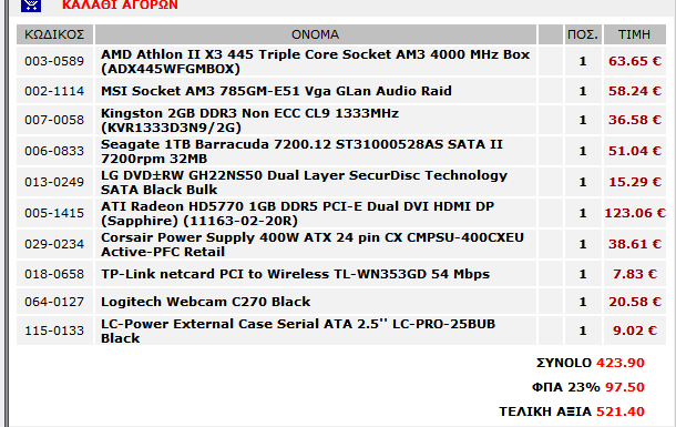 lionheart75 Δημοσ. 4 Σεπτεμβρίου 2010 Δημοσ. 4 Σεπτεμβρίου 2010 Λοιπόν μια προσπάθεια να περιοριστούμε στα 650,00 ευρώ. CASE: Antec Fusion Remote Black 144,23 + 5,00 μεταφορικά = 149,23 ευρώ Απο VISIONSTUDIO (έδρα Θεσσαλονίκη): CPU: Athlon X4 445 3.1Ghz 78,29 ευρώ (για 2 ευρώ περίπου διαφορά με τον 440 στην τιμή αξίζει να τον πάρεις) MOBO: MSI AM3 785GM-E51 71,64 ευρώ (Δεν υπάρχει διαθέσιμη φωτό στο site εδώ η μητρική απο τον κατασκευαστή. Πολύ καλή επιλογή για htpc και σε καλή τιμή.) RAM: OCZ Gold 4GB DDR3 CL9 1333MHz 84,53 ευρώ (Αυτές που σου προτάθηκαν αρχικά. Θέμα ασυμβατότητας δεν θα έχεις.) ΗDD: Seagate 1TB Barracuda 7200.12 62,78 ευρώ (Καλή επιλογή και αυτός, γρήγορος επίσης, δροσερός και με 5 έτη εγγύηση. Τον έχω τον συγκεκριμένο) GPU: ΧfX Radeon HD5750 512MB DDR5 118,90 ευρώ (Αυτή ακριβώς την υλοποίηση είχα στο προηγούμενο htpc μου και είναι τίμια καρτούλα. Κρύα για την δουλειά που τη θέλεις και ικανοποιητική στα παιχνίδια. Έτσι σου περισσεύουν και 36 ευρώ. Στην συνιστώ και αυτή λοιπόν.) Εναλλακτικά στη θέση της αν μπορείς να δώσεις λίγα παραπάνω ευρώ μπορείς να πάρεις την Club 3D Radeon HD5770 512MB DDR5 137,08 ευρώ (η οποία αποτελεί την πιο οικονομική λύση σε HD5770 με καλό και αθόρυβο σύστημα ψύξης της accelero όπως βλέπω). ΟPTICAL: LG DVD±RW GH22NS50 18,81 ευρώ PSU: Corsair Power Supply 400W 80+ 47,43 ευρώ (Μεταφορικά απο Visionstudio με κατάθεση σε τράπεζα διαμορφώνονται σε 3,81 ευρώ (+ 0,74 ανά επιπλέον κιλό ). Aπο Ε-world ( έδρα Πάτρα) CPU COOLER: Scythe Shuriken Rev.b 25,50 ευρώ (τα μεταφορικά με κατάθεση σε τράπεζα διαμορφώνονται σε 4,00 ευρώ). Νέο σύνολο λοιπόν για όλα + μεταφορικά με κατάθεση: 667,00 ευρώ. (Mε την HD5750 512mb και υπολογισμένα 6 κιλά βάρους) ή 685,00 (Με την HD5770 512mb και υπολογισμένα 6 κιλά βάρους)