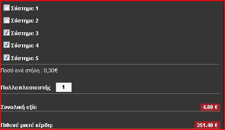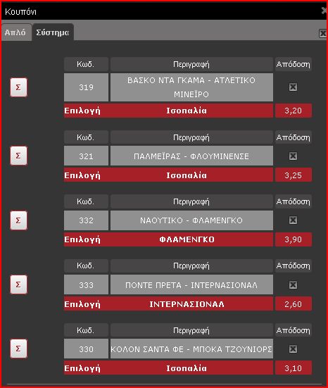 benign Δημοσ. 12 Νοεμβρίου 2012 Δημοσ. 12 Νοεμβρίου 2012 Παιδια ενα δυσκολο συστημα θα παιξω για σημερα με κατι ψιλα.Εχω την εντυπωση πως δεν ειναι καλη μερα γενικα,γινονται πολλα κουφα.Στις εικονες που ανεβαζω δειχνω τους αγωνες,το συστημα και τα πιθανα μικτα κερδη.Για να μην χασουμε ,πρεπει να πιασουμε 3 απο τα 5 σωστα. Τελικα με τις 3 ομαδες που πιασαμε(σε υψηλες αποδοσεις)τουλαχιστον δεν χασαμε και εχουμε και 6,8 ευρω κερδος.Next time. Edit: Το παραπανα σχολιο αφορα τον ληστρικο ΟΠΑΠ γιατι απο οτι βλεπω η Bet365 στο ιδιο δελτιο μου εδωσε 36 ευρω κερδος! 1