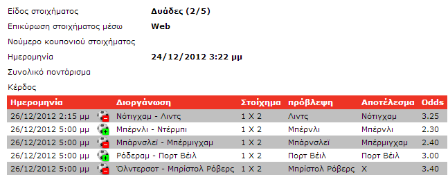 benign Δημοσ. 27 Δεκεμβρίου 2012 Δημοσ. 27 Δεκεμβρίου 2012 Παιδιά εκτός του ότι θα παίξω ένα σεβαστό ποσό στο να περάσει ο Ολυμπιακός στους 16 από την Λεβάντε με απόδοση @1.90 λέω να παίξω και ένα πολύ μικρό ποσό στις ομάδες που πιστεύω ότι θα περάσουν. Πείτε μου και εσείς γνώμες σε αυτά που έδω ήδη επιλέξει ή και αυτά που δεν κοίταξα. Έχει ψωμί ακόμη μέχρι τότε αλλά επειδή πιστεύω ότι οι τιμές θα αλλάζουν καλύτερο το ποντάρισμα τώρα μην πέσουν τιμές. 1.png EDIT Ρε παιδιά κανείς τίποτα σήμερα; Ταμειάρες σήμερα!!!!!! Η τελευταία στοιχηματική μέρα του 2012 για 'μενα πήγε καταπληκτικά. Τα λέμε με το 2013, ίσως παίξω και κάτι ψιλά απόψε Aston Villa - Tottenham @GG Stoke CIty - Liverpool @2 1.png Untitled.png Μπραβο Optimus!!!! (Και ας εισαι Γαβροπουλο! ) Εμενα ρε παιδες ολοι οι αγωνες μου αναβληθηκαν σε Αγγλια! Μα τι γινεται,λες και διαλεξα τις πιο ορεινες περιοχες της Βρεττανιας! Αυτο το κουπονι με τα κοκκινα γκρι χρωματα ,απο ποιο μπουμπουκι ειναι?