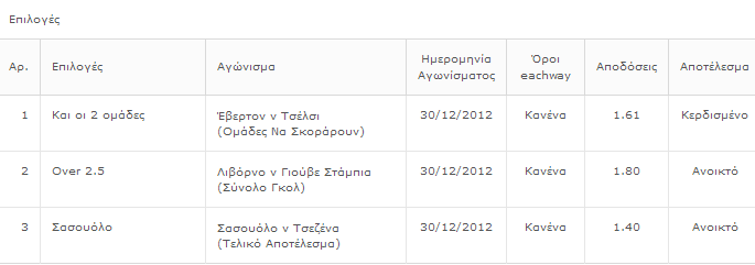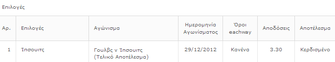 optimus_crime Δημοσ. 30 Δεκεμβρίου 2012 Δημοσ. 30 Δεκεμβρίου 2012 Μπραβο Optimus!!!! (Και ας εισαι Γαβροπουλο! ) Εμενα ρε παιδες ολοι οι αγωνες μου αναβληθηκαν σε Αγγλια! Μα τι γινεται,λες και διαλεξα τις πιο ορεινες περιοχες της Βρεττανιας! Αυτο το κουπονι με τα κοκκινα γκρι χρωματα ,απο ποιο μπουμπουκι ειναι? Από την betoto είναι... Χθες καλό ταμείο και συνεχίζω σήμερα... Τελικά τα μονά δελτία είναι τα καλύτερα... Υ.Γ Ναι ρε, είμαι γαβρόπουλο