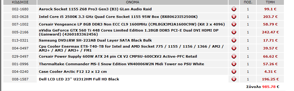 Thanos1972 Δημοσ. 13 Μαρτίου 2012 Δημοσ. 13 Μαρτίου 2012 Επεξεργαστης Intel Core i5 2500K 3.3 GHz Quad Core Socket 1155 95W Box ΤΙΜΗ 203.70 € Ψυχτρα Επεξεργαστη Coolermaster Hyper 212 Evo ΤΙΜΗ 37.48 € Μητρικη Asrock Socket 1155 Z68 Pro3 Gen3 (B3) ΤΙΜΗ 99.10 € Μνημη Kingston Hyper X 8GB DDR3 Non ECC CL9 1600MHz ΤΙΜΗ 50.25 € Καρτα γραφικων nVidia GeForce GTX 560 Ti 448 Cores Limited Edition 1.28GB DDR5 PCI-E Dual DVI HDMI DP (Gainward) ΤΙΜΗ 242.47 € (δεν ειναι η απλη ti) Ssd OCZ 60GB Agility III AGT3-25SAT3-60G Solid State Drive SATA SSD 2.5'' ΤΙΜΗ 77.65 € Σκληρος Seagate 1TB Barracuda 7200.12 ST1000DM003 SATA III 7200rpm 64MB ΤΙΜΗ 98.01 € Τροφοδοτικο Corsair Power Supply 600W ATX 24 pin CX V2 ΤΙΜΗ 66.62 € Κουτι Enermax Staray Lite ECA3175-L ΤΙΜΗ 46.19 € Dvd recorder Sony DVD±RW AD-7280S Dual Layer SATA ΤΙΜΗ 17.56 € Οθονη LG LCD LED 23'' IPS235V-BN ΤΙΜΗ 167.92 € (με ips πανελ) Συνολο 1106,95 Edit:busted αλλα Terry βαλε και το dvd μεσα ρε'ι'...