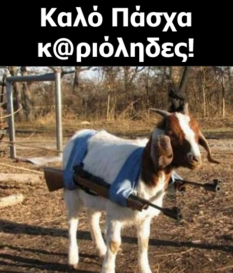 Haldol Δημοσ. 7 Απριλίου 2015 Δημοσ. 7 Απριλίου 2015 Καλό Πάσχα Αυτό είν' γκατσίκα. Αρνιά σουβλίζουμε.