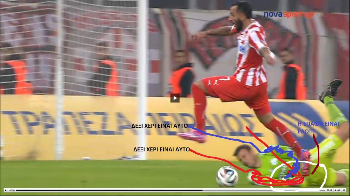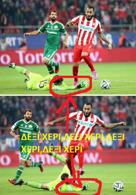 Tiger.7 Δημοσ. 27 Οκτωβρίου 2014 Δημοσ. 27 Οκτωβρίου 2014 Οχι, το χέρι που πετυχαίνει ο Μήτρογλου ή αλλιώς αυτο που βρισκει τον Μητρογλου όπως λες εσύ. Δεν είπα εγώ ότι είναι το δεξί του... δικό σου ήταν το λάθος. Αγορι μου κοιτα.Αυριο ειναι Δευτερα,ολοι οι οφθαλμιατροι ειναι ανοιχτοι και δουλευουν.Παρε την φωτογραφια την παρακατω και δειξτην τους,πες τους οτι στο κυκλωμενο σημειο και στη ακρη του βελους που εχω φτιαξει,βλεπεις δεξι χερι και μαλιστα κολλημενο στο σωμα και να εισαι σιγουρος οτι θα σε δεχτουν για εξεταση χωρις καν ραντεβου!!! Ξεχωριστα χρωματα για καθε χερι.Οριστε και το κουιζ...Ποιο χερι ειναι αυτο που κανει την επαφη με το ποδι του Μητρογλου (παλι με χρωμα.Αν ουτε τωρα.. λυπαμαι)