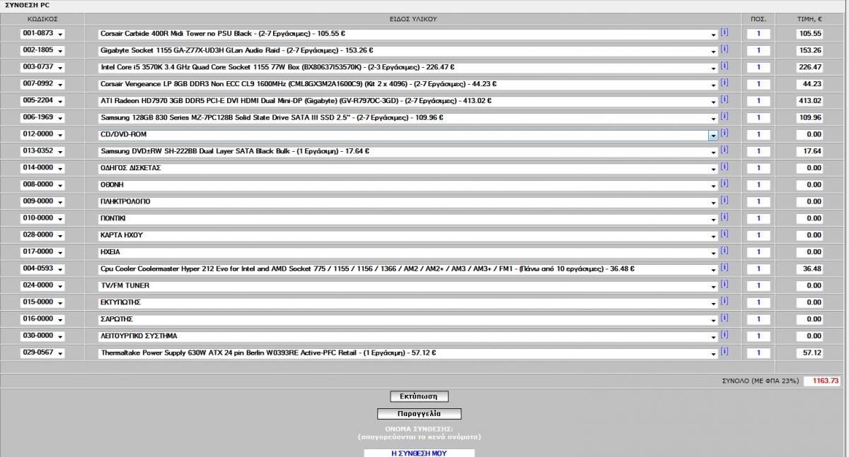 Δεινόσαυρος Δημοσ. 23 Σεπτεμβρίου 2012 Δημοσ. 23 Σεπτεμβρίου 2012 Καλησπέρα. Το eshop δεν έχει ποικιλία και καλές τιμές, ωστόσο επειδή το μπάτζετ σου είναι μεγάλο μπορεί να βγει καλή σύνθεση. Ο επεξεργαστής που διάλεξες είναι κλειδωμένος ενώ η μητρική που κοιτάς προσφέρεται για overclocking. Αντίφαση δηλαδή. Επίσης η μητρική φοραέι παλιό chipset, καλύτερα με τον 3570K να πας σε z77. Δες το παρακάτω: Κουτί: http://www.e-shop.gr/showDetail_main.phtml?id=PER.700589 Τροφοδοτικό: http://www.e-shop.gr/showDetail_main.phtml?id=PER.549229 Επεξεργαστής: http://www.e-shop.gr/showDetail_main.phtml?id=PER.558362 Μητρική: http://www.e-shop.gr/showDetail_main.phtml?id=PER.528644 Μνήμη: http://www.e-shop.gr/showDetail_main.phtml?id=PER.552645 Κάρτα γραφικών: http://www.e-shop.gr/showDetail_main.phtml?id=PER.513576 SSD: http://www.e-shop.gr/showDetail_main.phtml?id=PER.320754 Σκληρός: http://www.e-shop.gr/showDetail_main.phtml?id=PER.303636 DVD-RW: http://www.e-shop.gr/showDetail_main.phtml?id=PER.321031 (κάποιο μάυρο) 1324 ευρώ.