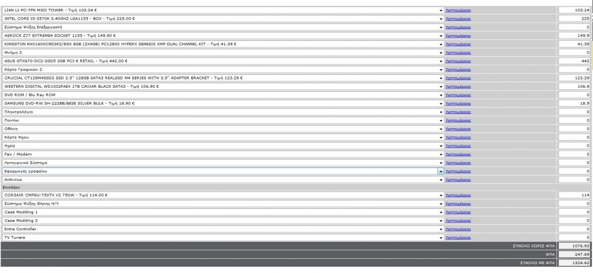 jimmyp Δημοσ. 23 Σεπτεμβρίου 2012 Δημοσ. 23 Σεπτεμβρίου 2012 Γεια σας, ενδιαφέρομαι για νέο Pc μέχρι 1300€ μόνο για τον πύργο. Έχω καταλήξει στον επεξεργαστή αυτόν. Ό,τι προτείνετε, παρακαλώ να είναι αποκλειστικά από το Ε-shop γιατί με εξυπηρετεί καλύτερα. Σχετικά με τη μητρική, έχω δει αυτή. Επειδή δεν είμαι και πολύ σχετικός, μήπως θα μπορούσατε να μου προτείνετε ένα σύστημα με αυτόν τον επεξεργαστή; Να προσθέσω ότι θα ήθελα μια αξιόλογη κάρτα γραφικών για να μπορώ να παίξω κανα παιχνιδάκι και να μη χρειαστεί να την αναβαθμίσω στο άμεσο μέλλον. Ευχαριστώ. Ποσό που διαθέτουμε :1300 Χρήση υπολογιστή : Γενική, gaming Ειδικά προγράμματα που θα χρησιμοποιήσουμε: Όχι Οθόνη: Όχι Αν στη σύνθεση χρειαζόμαστε και πληκτρολόγιο,ηχεία,ποντίκι? όχι Τοποθεσία στην οποία βρισκόμαστε ( για την επιλογή κατάλληλου καταστήματος). Καλαμάτα Αν τα κομμάτια που θέλουμε να αγοράσουμε θέλουμε να είναι απο ένα κατάστημα ή επιθυμούμε την αγορά απο διαφορετικά καταστήματα? Από ένα, E-Shop κατά προτίμηση Αν επιθυμούμε να συναρμολογηθεί το σύστημα στο κατάστημα(στην περίπτωση που δεν γνωρίζουμε πως να το συναρμολογήσουμε) ή το σύστημα θα στηθεί απο τον ενδιαφερόμενο? Από το κατάστημα Αν επιθυμούμε λειτουργικό σύστημα και πιο . Windows 7 - 64bit