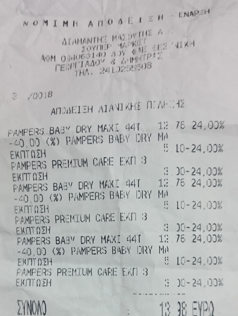 aklostr Δημοσ. 30 Μαΐου 2017 Δημοσ. 30 Μαΐου 2017 Μασούτης Pampers Baby Dry No4 (44 τεμάχια) Στο -40% που ισχύει στο Μασούτη για τα συγκεκριμένα Pampers, υπάρχει επιπλέον 3e έκπτωση. Τελική τιμή συσκευασίας 4,66 . Τιμή ανά πάνα 0,106. Προσοχή ισχύει σίγουρα για τις συγκεκριμένες. Σε 4+ που δοκίμασα δεν είχε το επιπλέον -3e. Sorry για την ποιότητα της φωτό, μάπα ταμειακή...