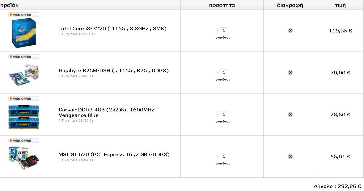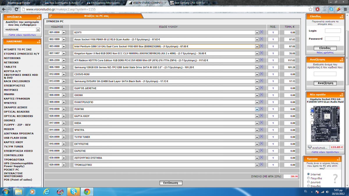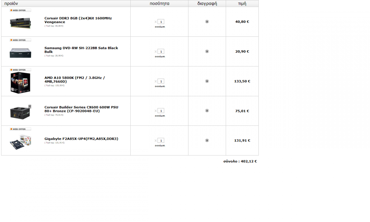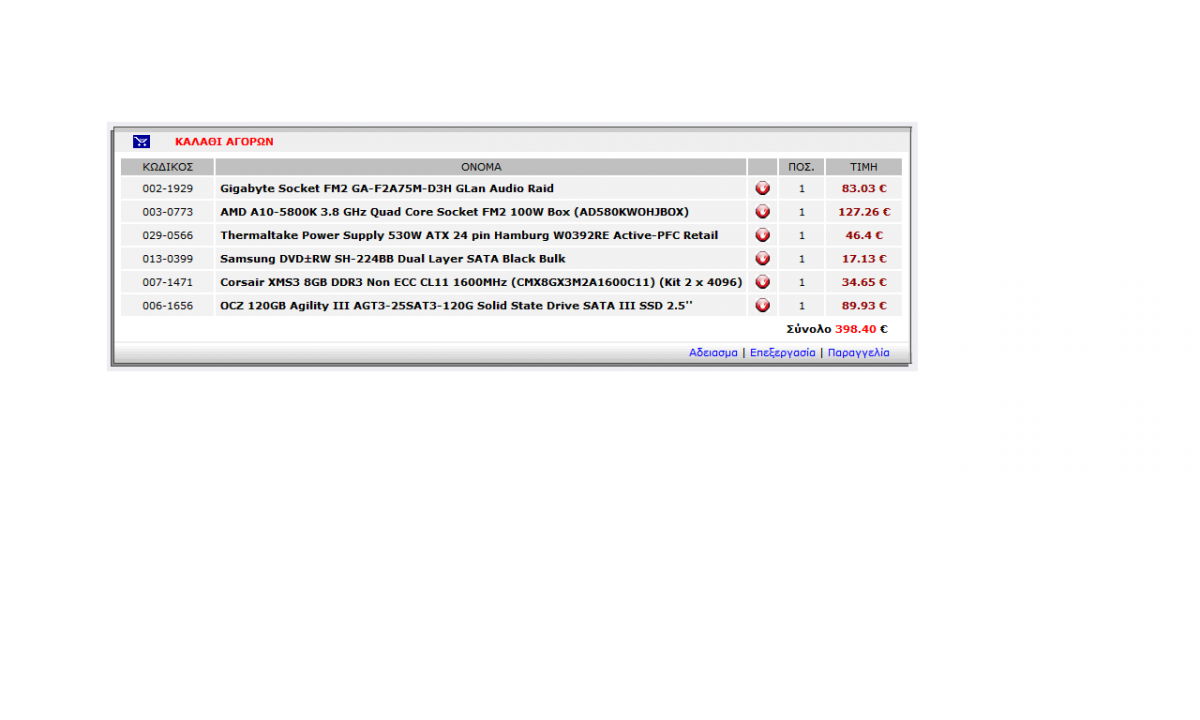 jimakos9 Δημοσ. 18 Οκτωβρίου 2012 Δημοσ. 18 Οκτωβρίου 2012 Ποσό που διαθέτουμε : μεχρι 400ε Χρήση υπολογιστή : λιγο απο ολα Ειδικά προγράμματα που θα χρησιμοποιήσουμε: περα απο auto-cad οχι κατι τρομερο. Αν στη σύνθεση χρειαζόμαστε οθόνη? Αν όχι ποια οθόνη έχουμε και αν σκεφτόμαστε να αγοράσουμε μελλοντικά μια άλλη. οχι Αν στη σύνθεση χρειαζόμαστε και πληκτρολόγιο,ηχεία,ποντίκι? οχι Τοποθεσία στην οποία βρισκόμαστε ( για την επιλογή κατάλληλου καταστήματος). αθηνα Αν τα κομμάτια που θέλουμε να αγοράσουμε θέλουμε να είναι απο ένα κατάστημα ή επιθυμούμε την αγορά απο διαφορετικά καταστήματα? δν εχω προβλημα. Αν επιθυμούμε να συναρμολογηθεί το σύστημα στο κατάστημα(στην περίπτωση που δεν γνωρίζουμε πως να το συναρμολογήσουμε) ή το σύστημα θα στηθεί απο τον ενδιαφερόμενο? μπορω να το στησω εγω... Αν επιθυμούμε λειτουργικό σύστημα και πιο . οχι έχω. Εχω ενα pc αλλα τα εχει φαει τα χρονακια του. ωστοσο το κουτι θα το κρατησω καθως και 2 σκληρους δισκους που εχω. οσον αφορα το τροφοδτικο εχω ενα chieftec cft500w, μπορω να το κρατησω ή χρειαζεται να παρω καινουριο; απο κει και περα τι μ προτεινετε; ποια ειναι η αποψη σας για αυτα που διαλεξα στη φωτογραφια;