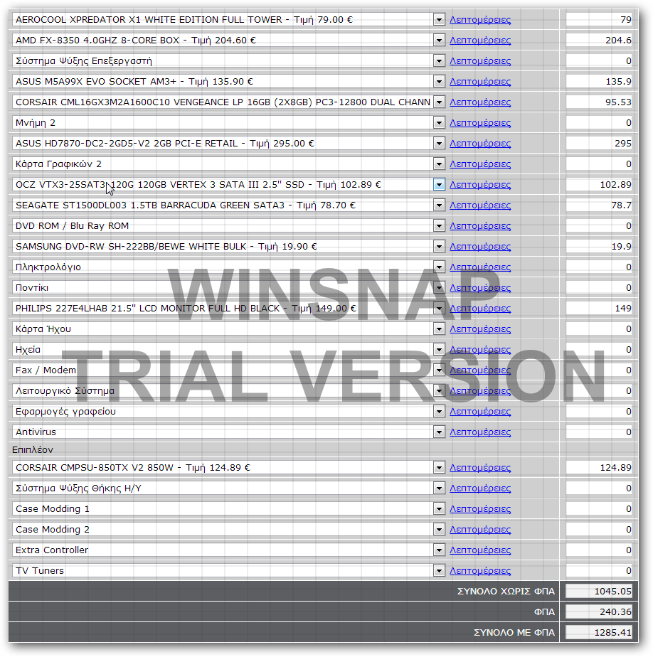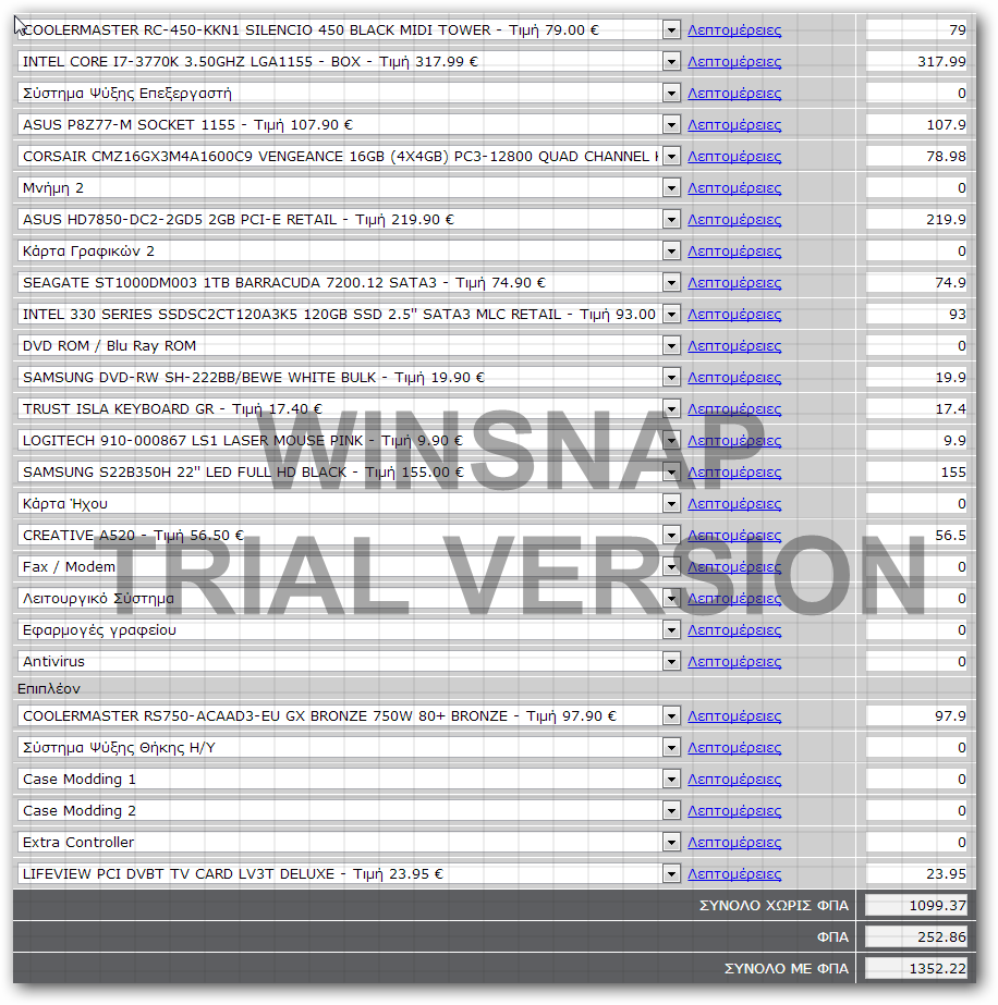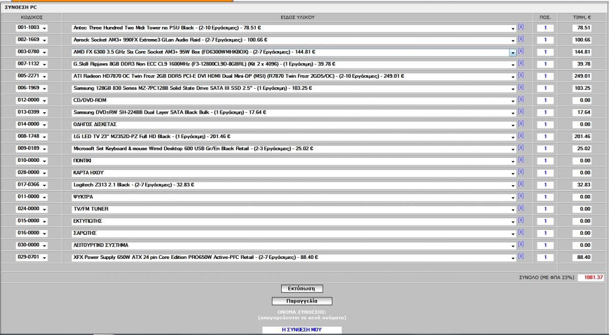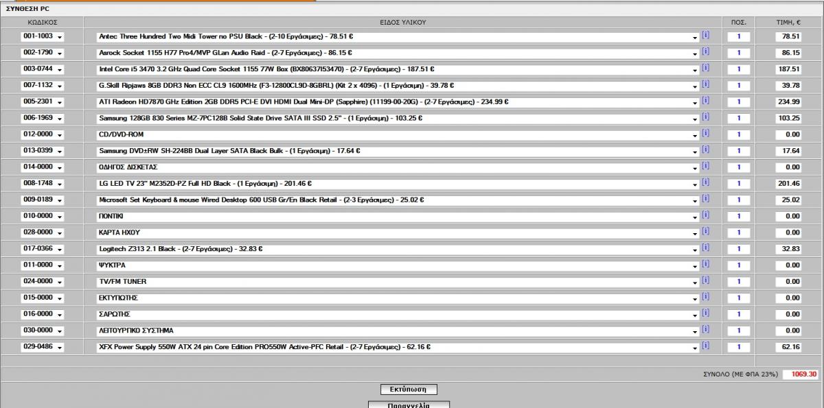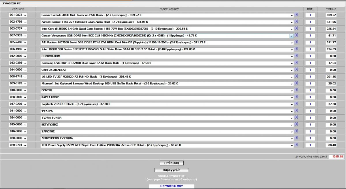 panoutsi Δημοσ. 20 Νοεμβρίου 2012 Δημοσ. 20 Νοεμβρίου 2012 (επεξεργασμένο) παρακαλώ τη γνώμη σας παιδιά και καμιά διόρθωση μήπως ρίξουμε λιγάκι το κόστος Ποσό που διαθέτουμε :γύρω στο 1000 Χρήση υπολογιστή :παιχνίδια δυνατά,ταινίες,ίντερνετ,γραφείο Ειδικά προγράμματα που θα χρησιμοποιήσουμε:προς το παρόν όχι ίσως χρειαστεί επεξεργασία φωτο η βίντεο Υπάρχει οθόνη στη μικρογραφία Επίσης υπάρχουν πληκτρολόγιο,ηχεία,ποντίκι Θεσσαλονίκη Τα κομμάτια είναι προτιμότερο από ένα κατάστημα Θα συναρμολογηθει από εμένα. Επεξ/σία 21 Νοεμβρίου 2012 από panoutsi